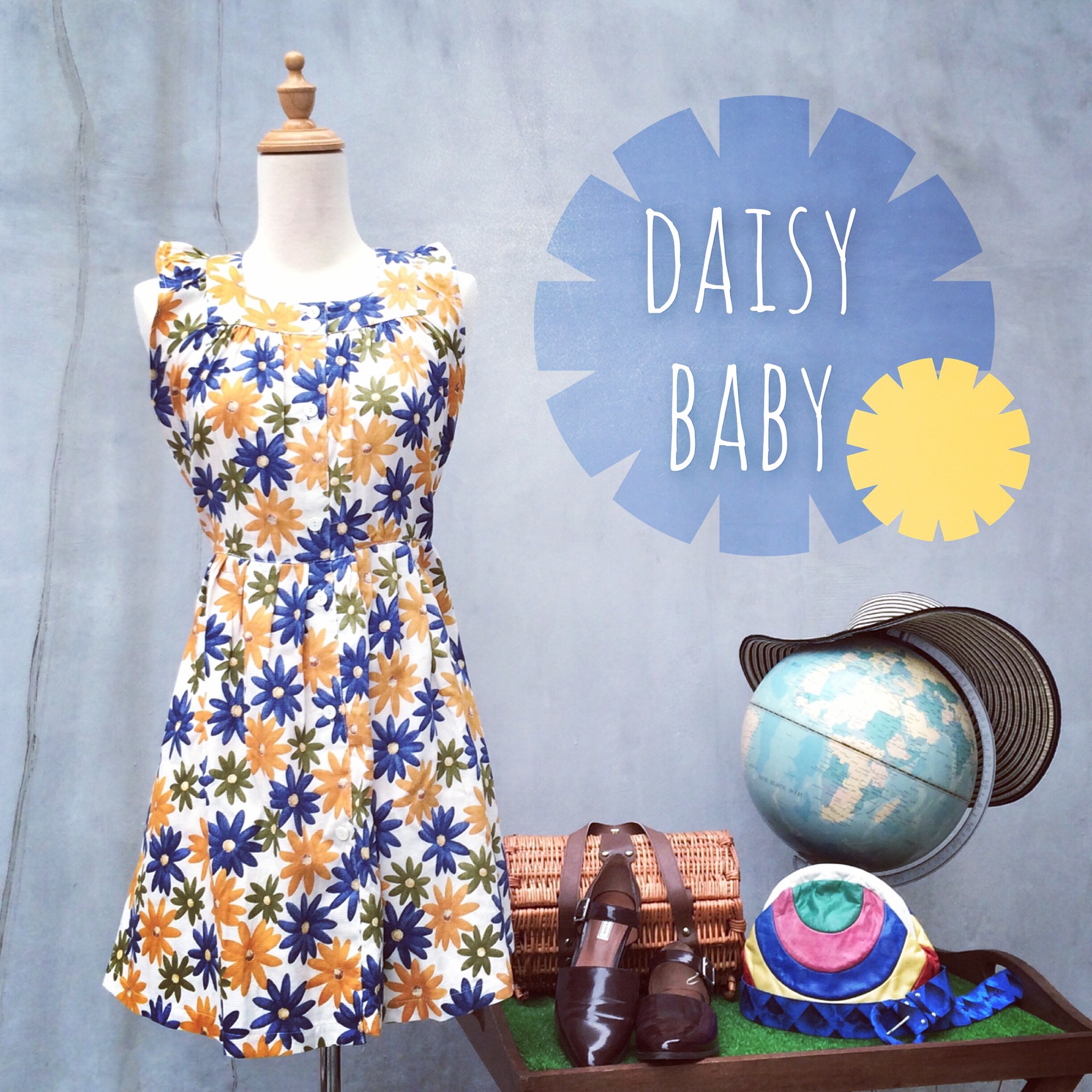 A short number in the happiest yellow, blue and olive green daisy prints ever! On what seems like barkcloth fabric, the colors sink in so nicely they do not come off too garish. Perfect vintage style. We can imagine the hot mamas of the 1960s rockin’ this in and out of the house. Comes with the prettiest slightly ruffled sleeves. It looks like it’s a button-down all the way but the bottom half is actually sealed shut so no ‘oppsy-daisy’ moments there ;0) Buttons open up to the waist.