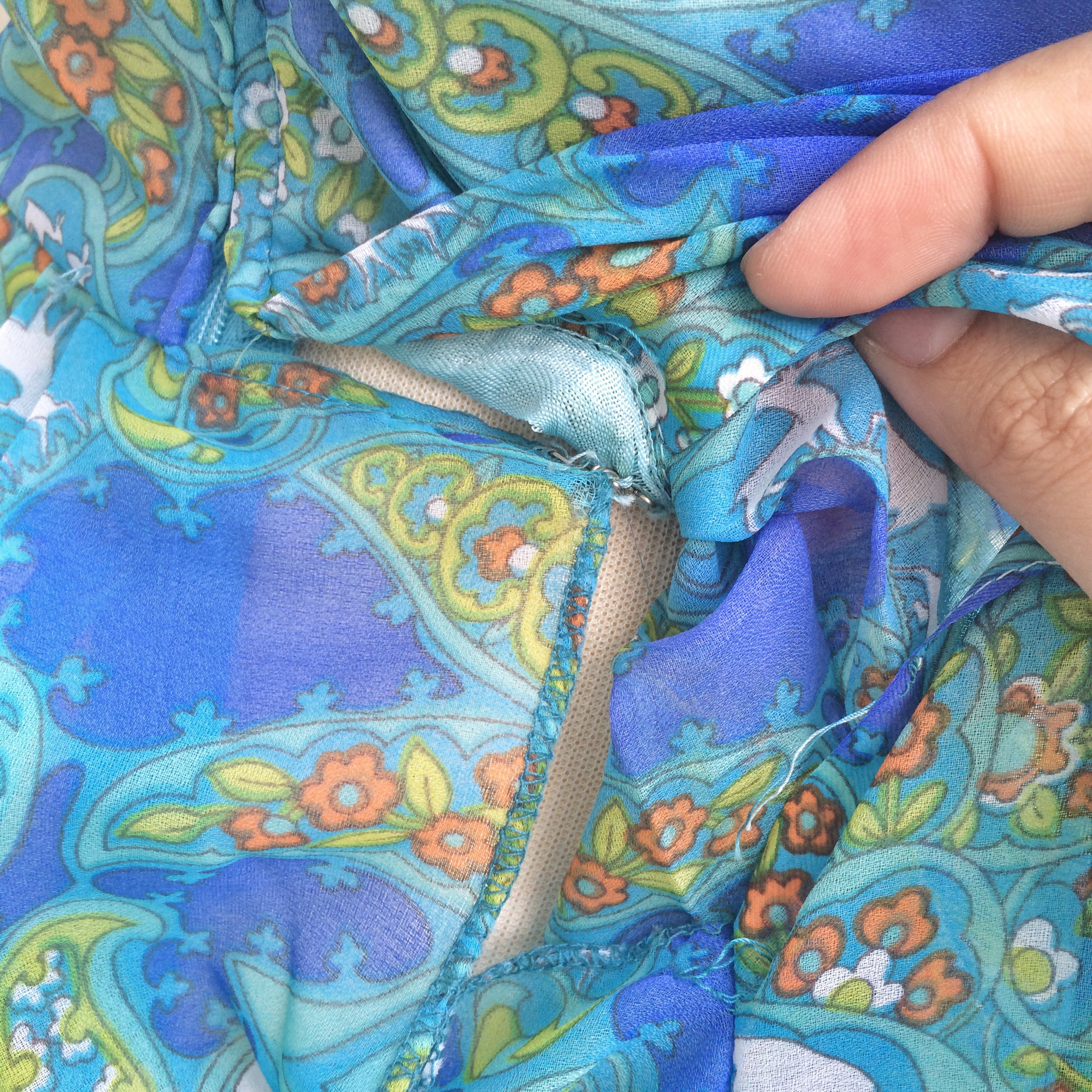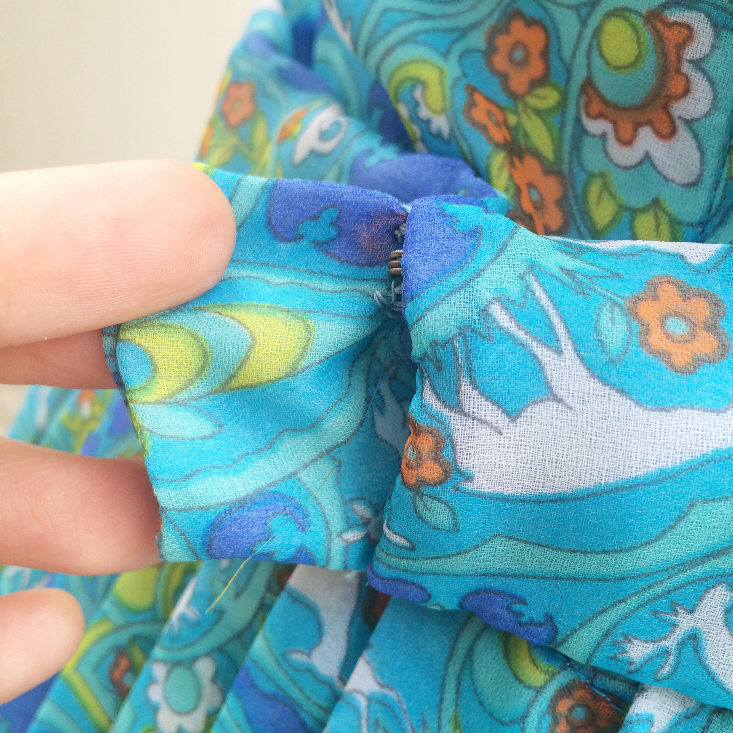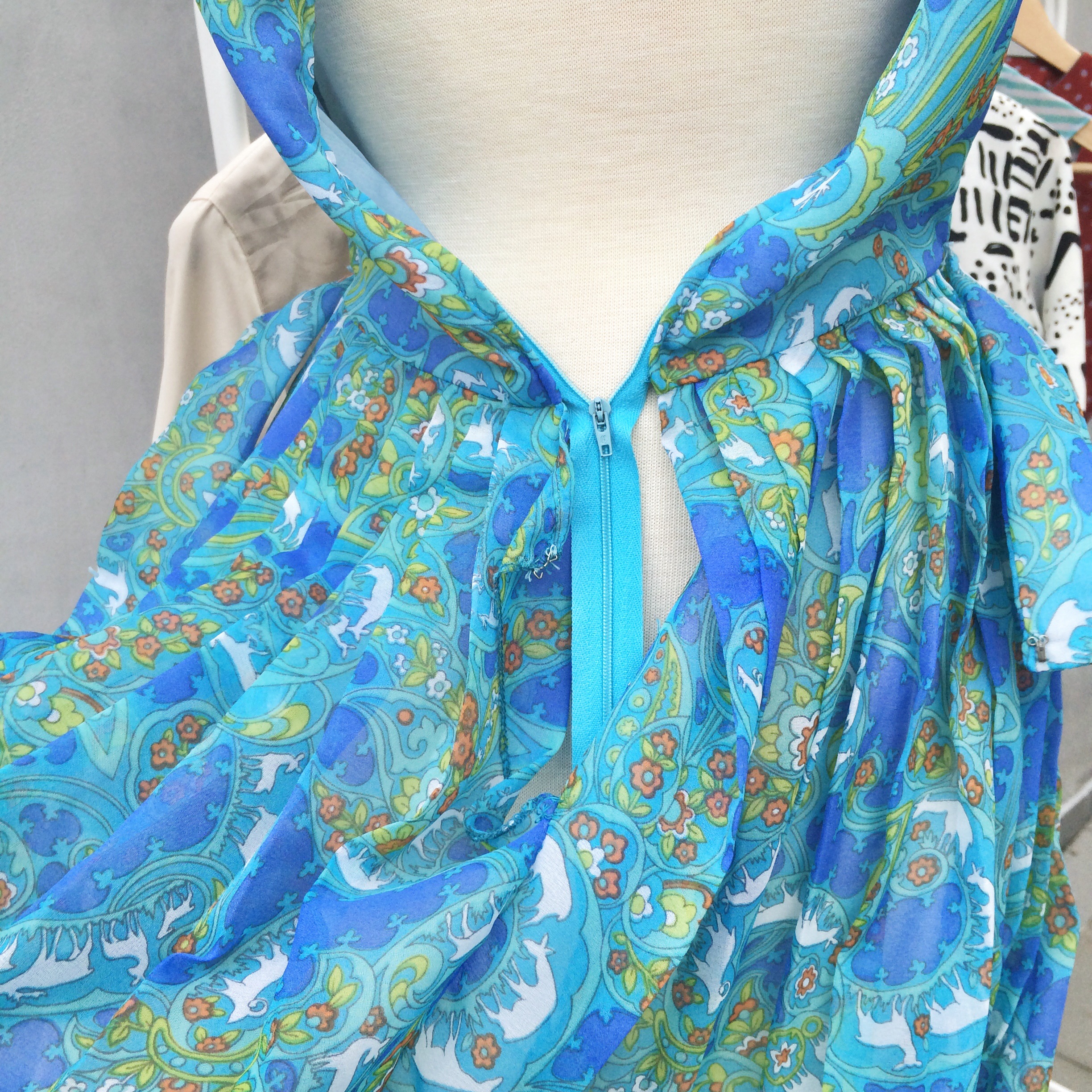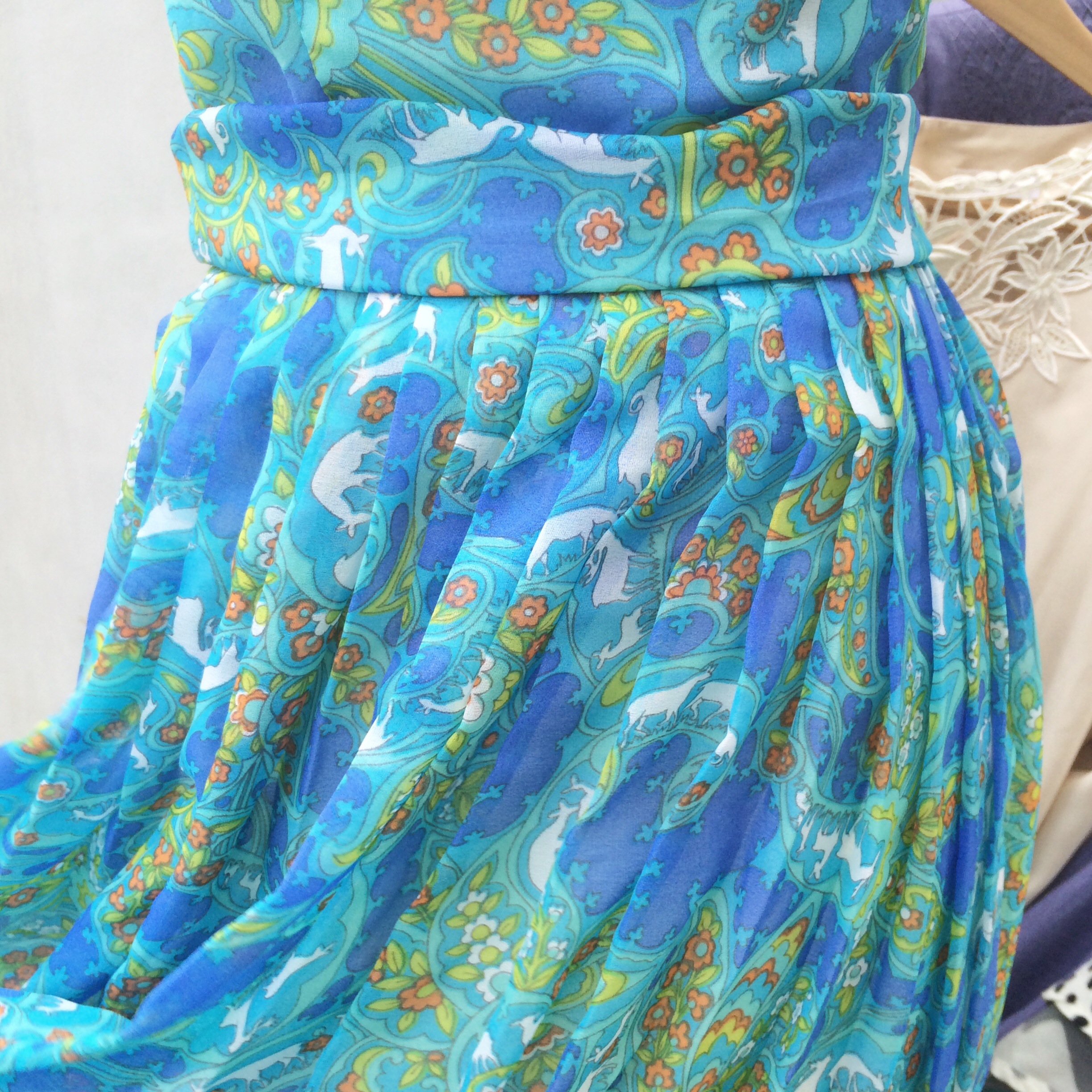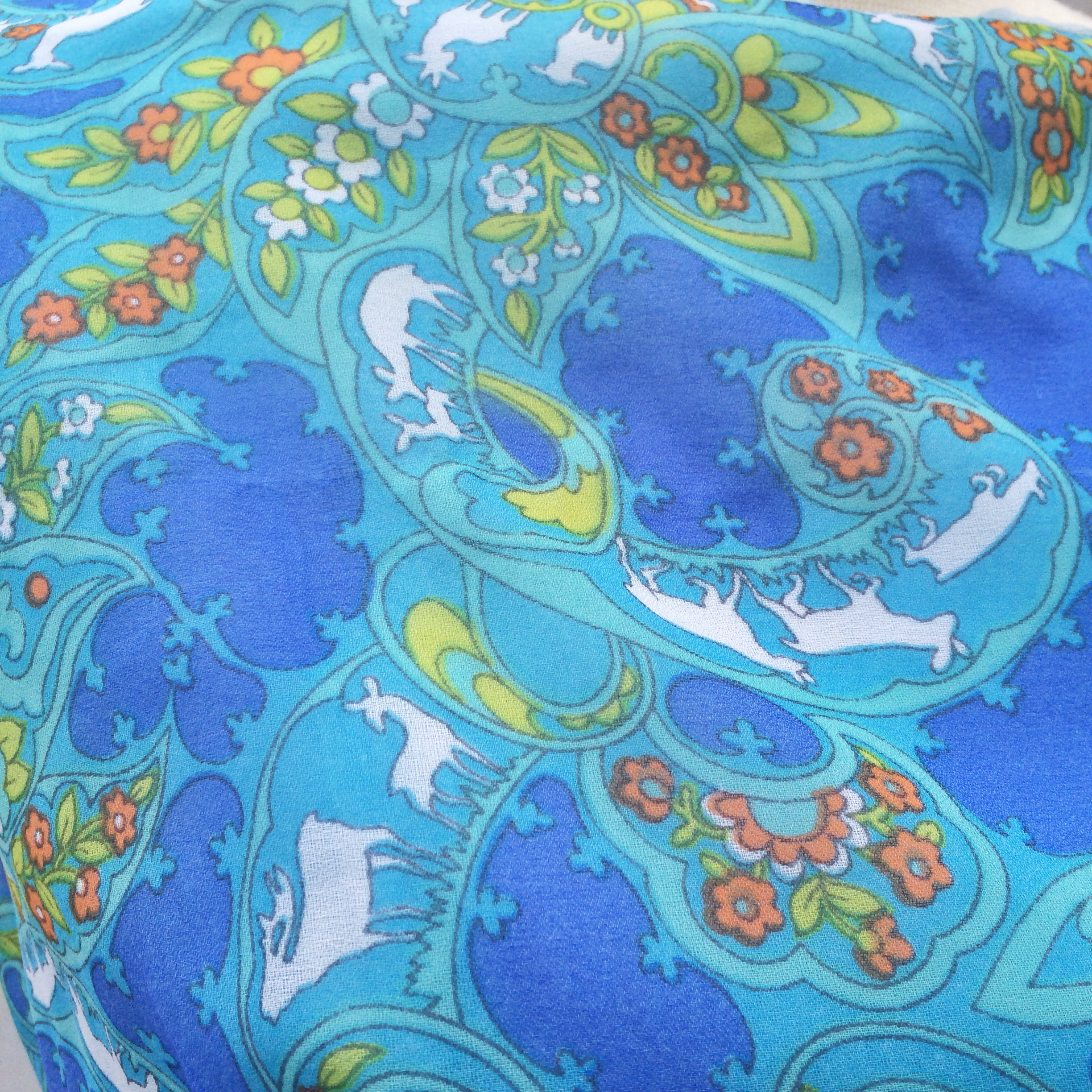 This comes in a beautiful paisley print in a fun 60s mix of blues, greens, oranges and yellows and reindeer silhouettes having a walk throughout the fabric. And the material is so light it is almost ethereal.