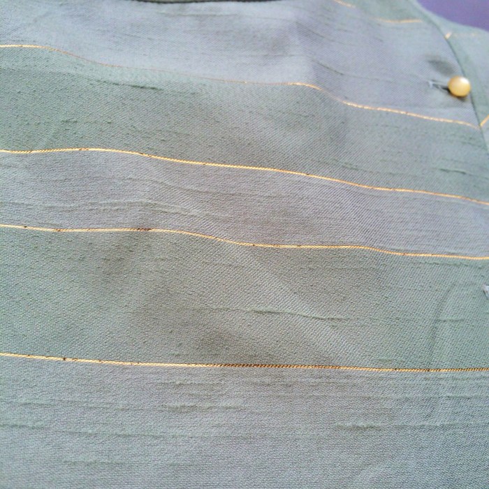 The pastel green is as light as the blue one if bright! The gentlest, elegant, demure color, with gold threads running through it and the most darling spherical buttons on one side.