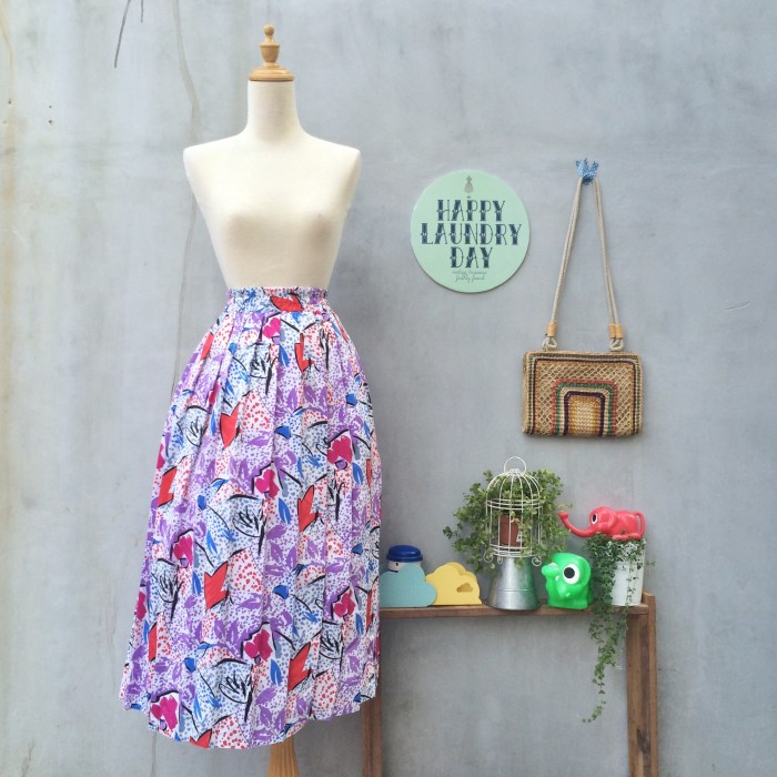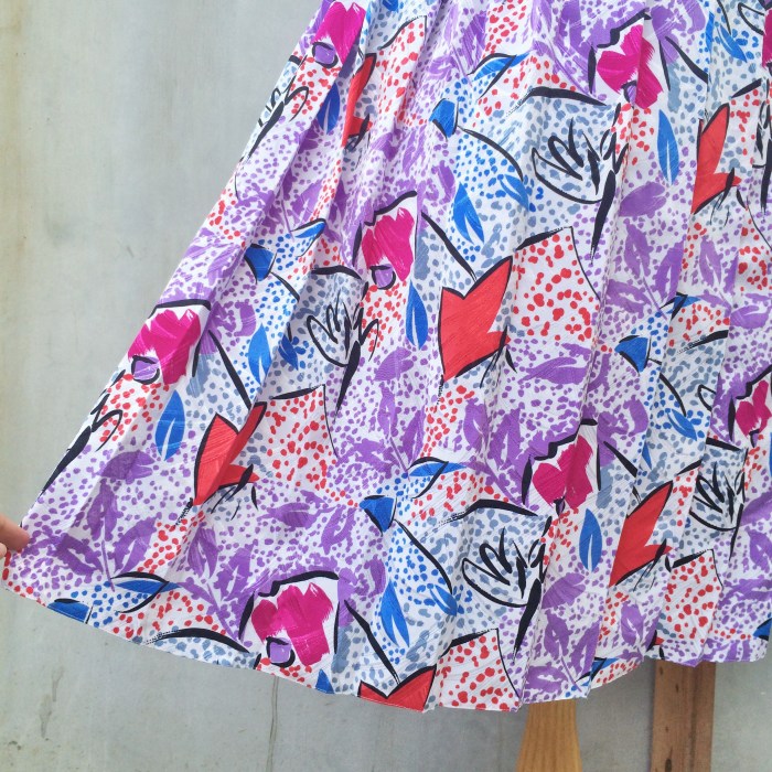 Don’t you just love these happy colors and prints? We absolutely love this 80s pleated calf-length skirt! Geometric shapes and polka dotted fly through the wide-pleats and a slightly shiny textured fabric!