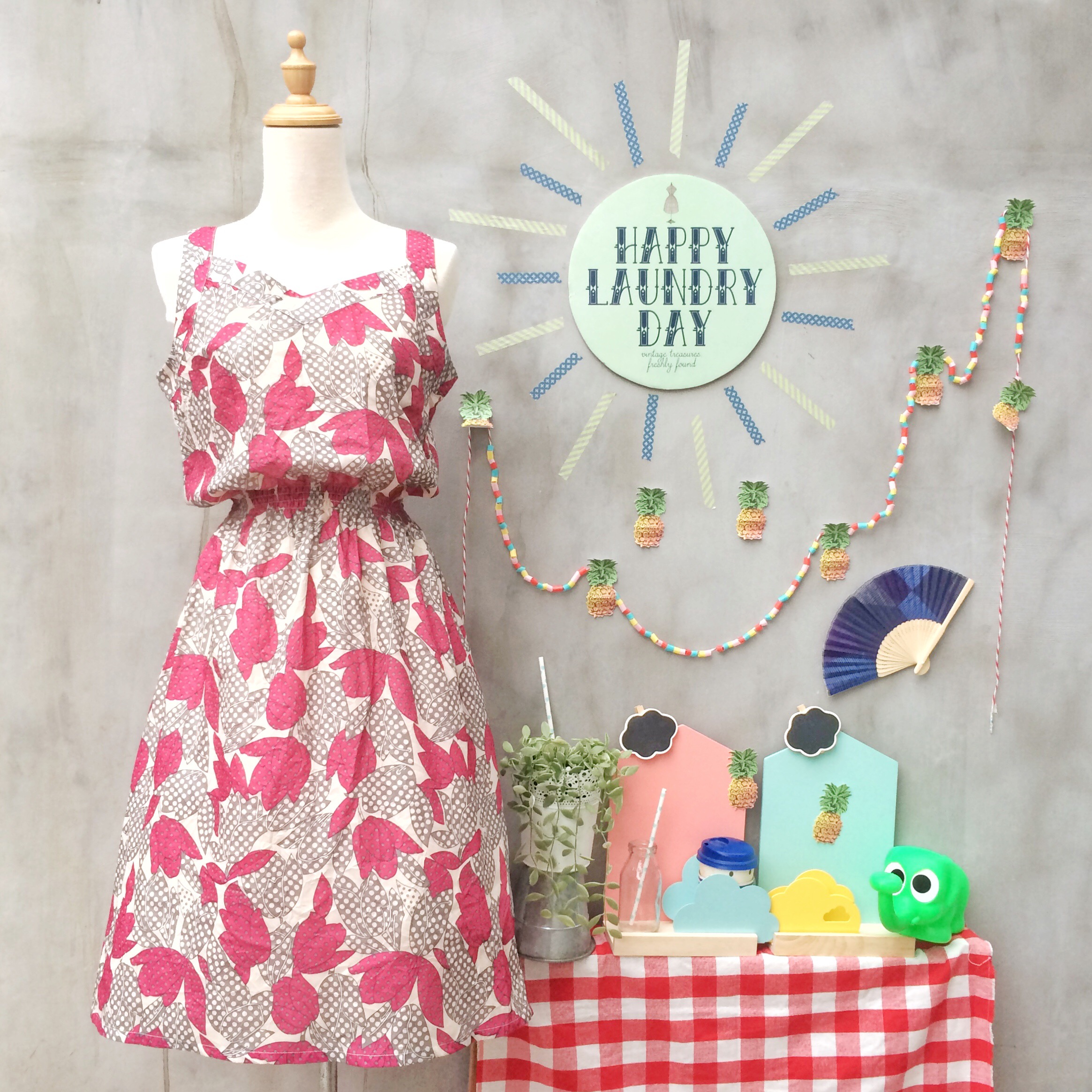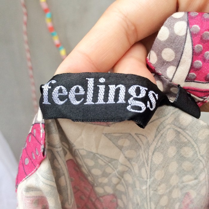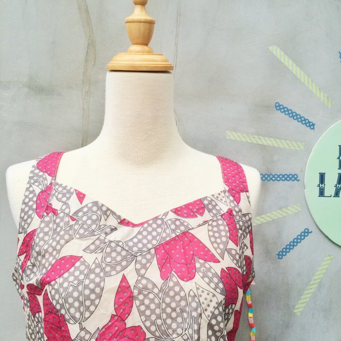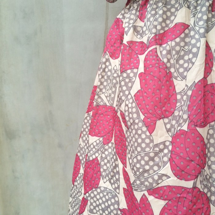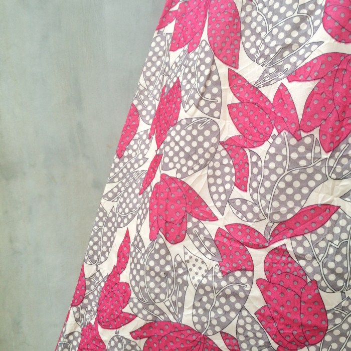 And we love the slight V-neckline and the cute polka dot tulips in the subtle and yet fun colours of beige, khaki-grey and pomegranate darkish red!