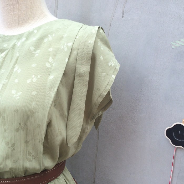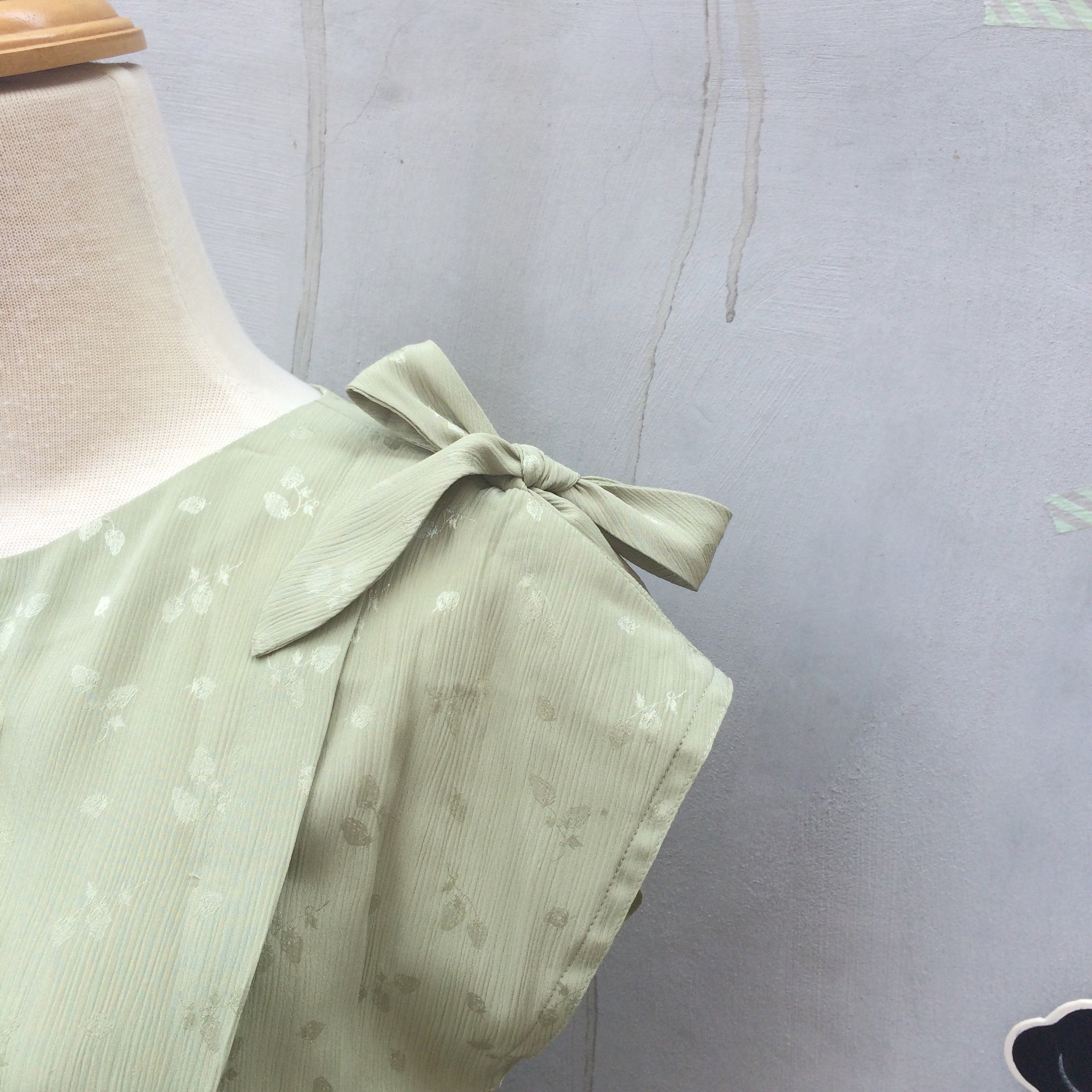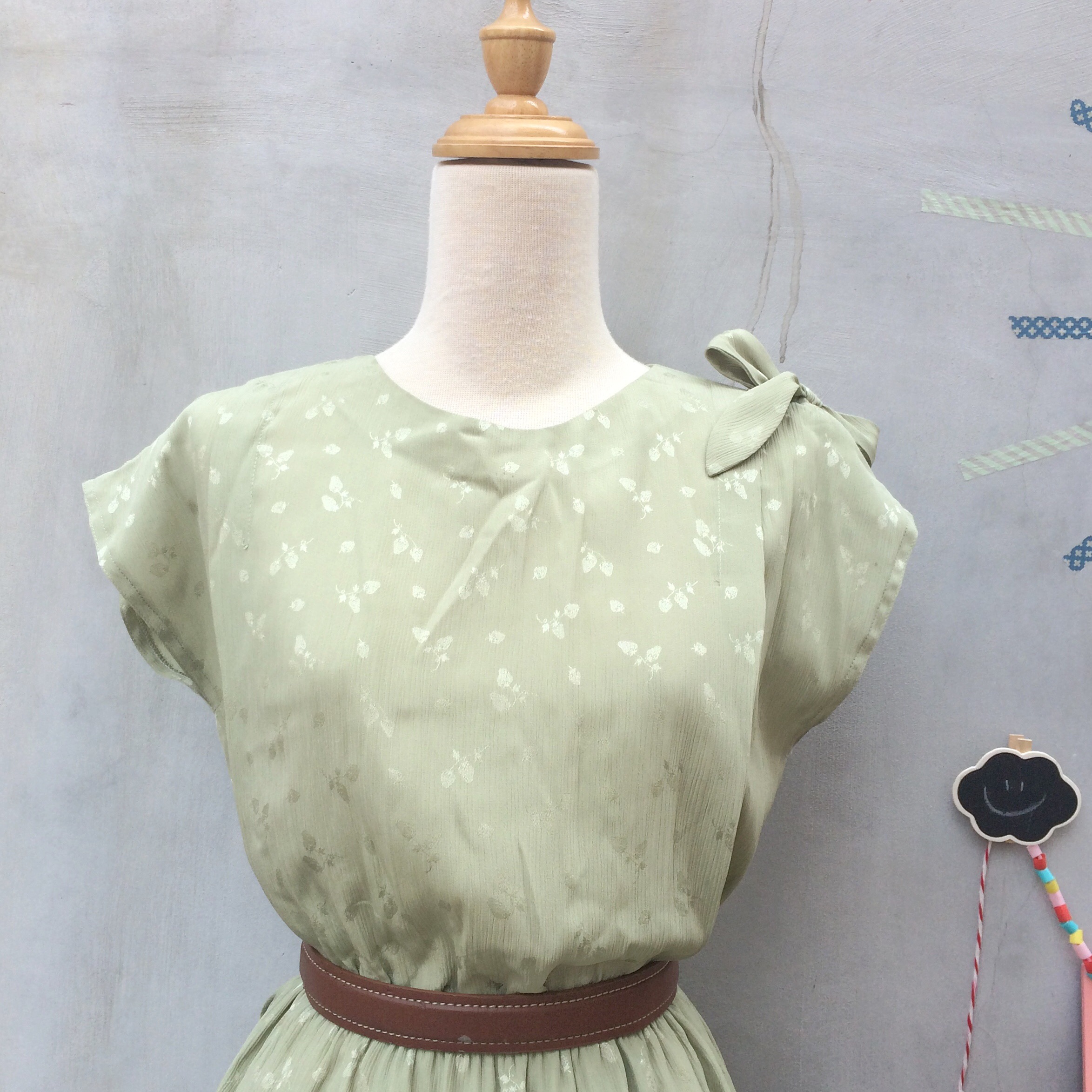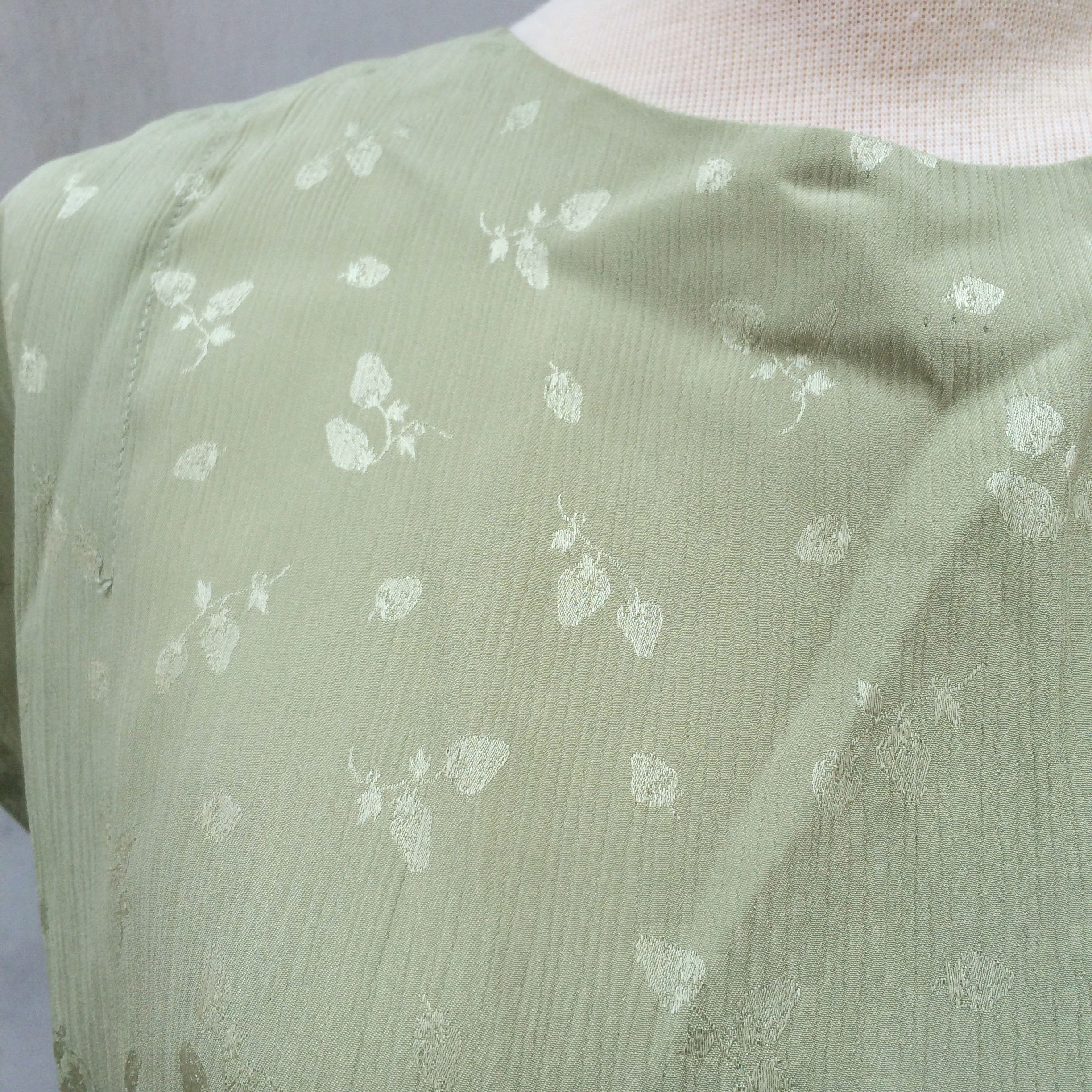 Pastel green textured flocked strawberries print Vintage 1930s dress with the sweetest little bow on one shoulder – best fits a S – M.