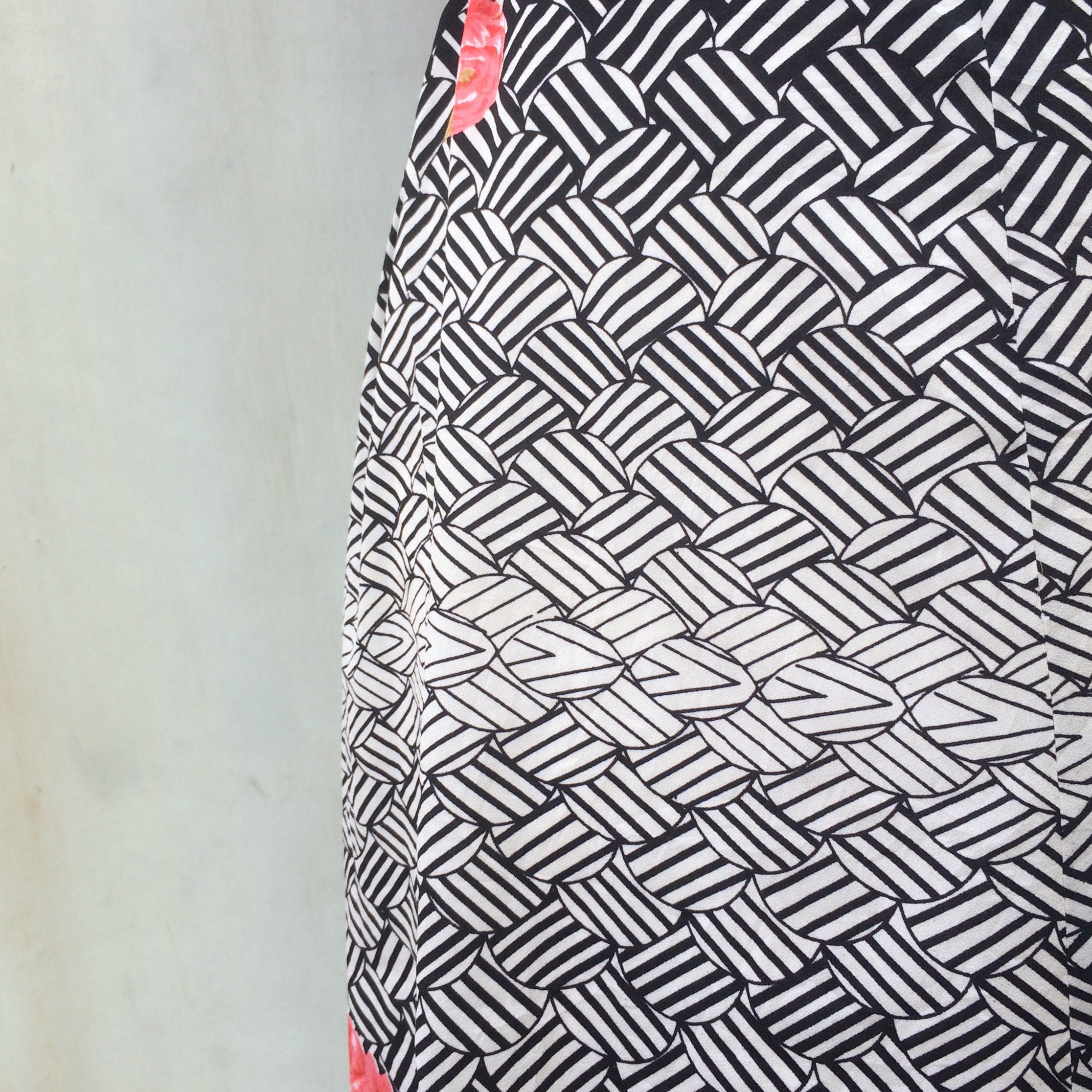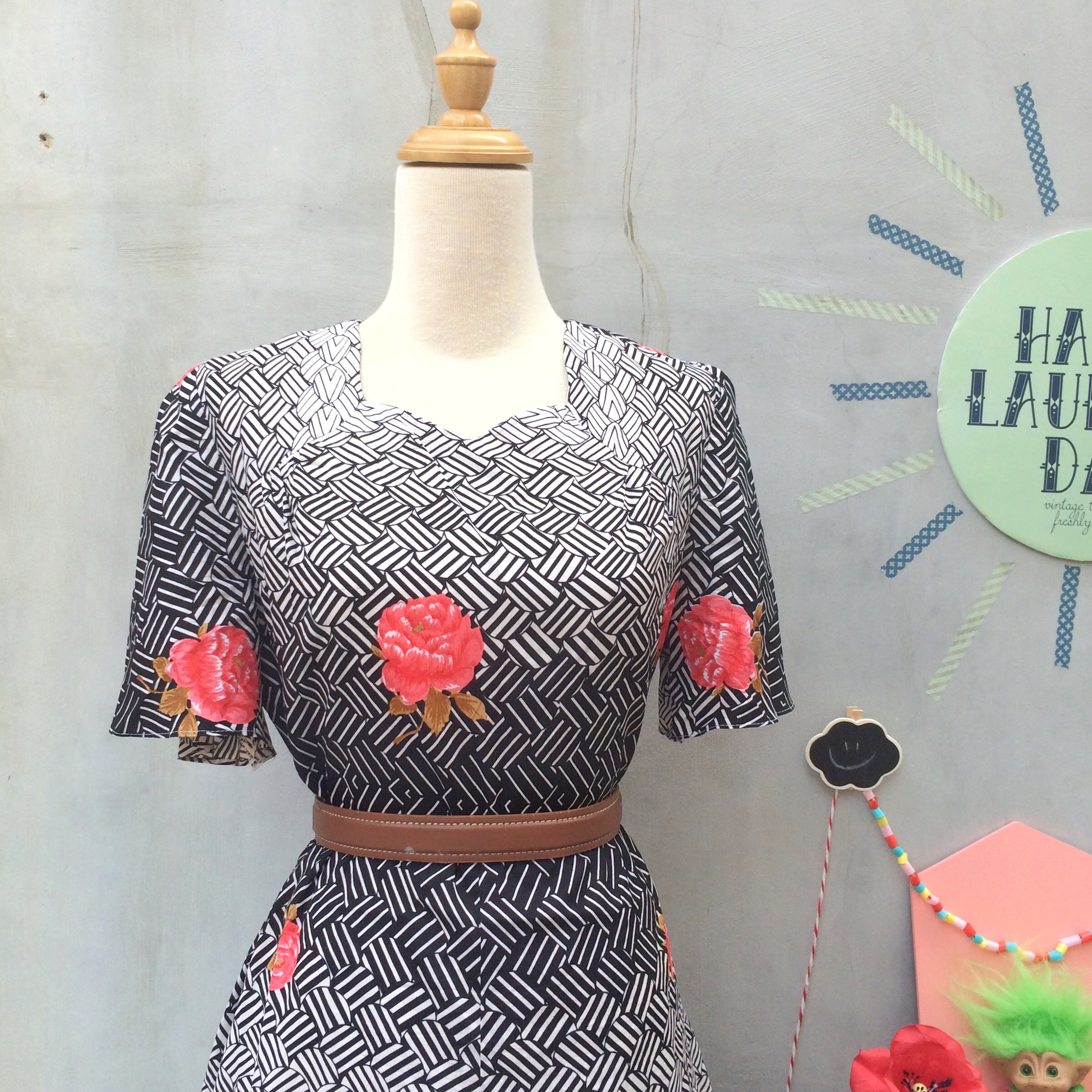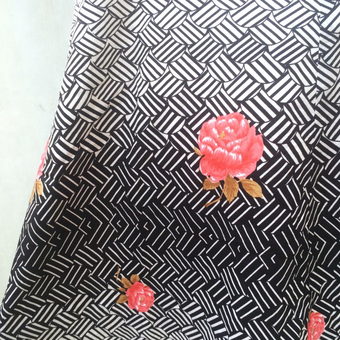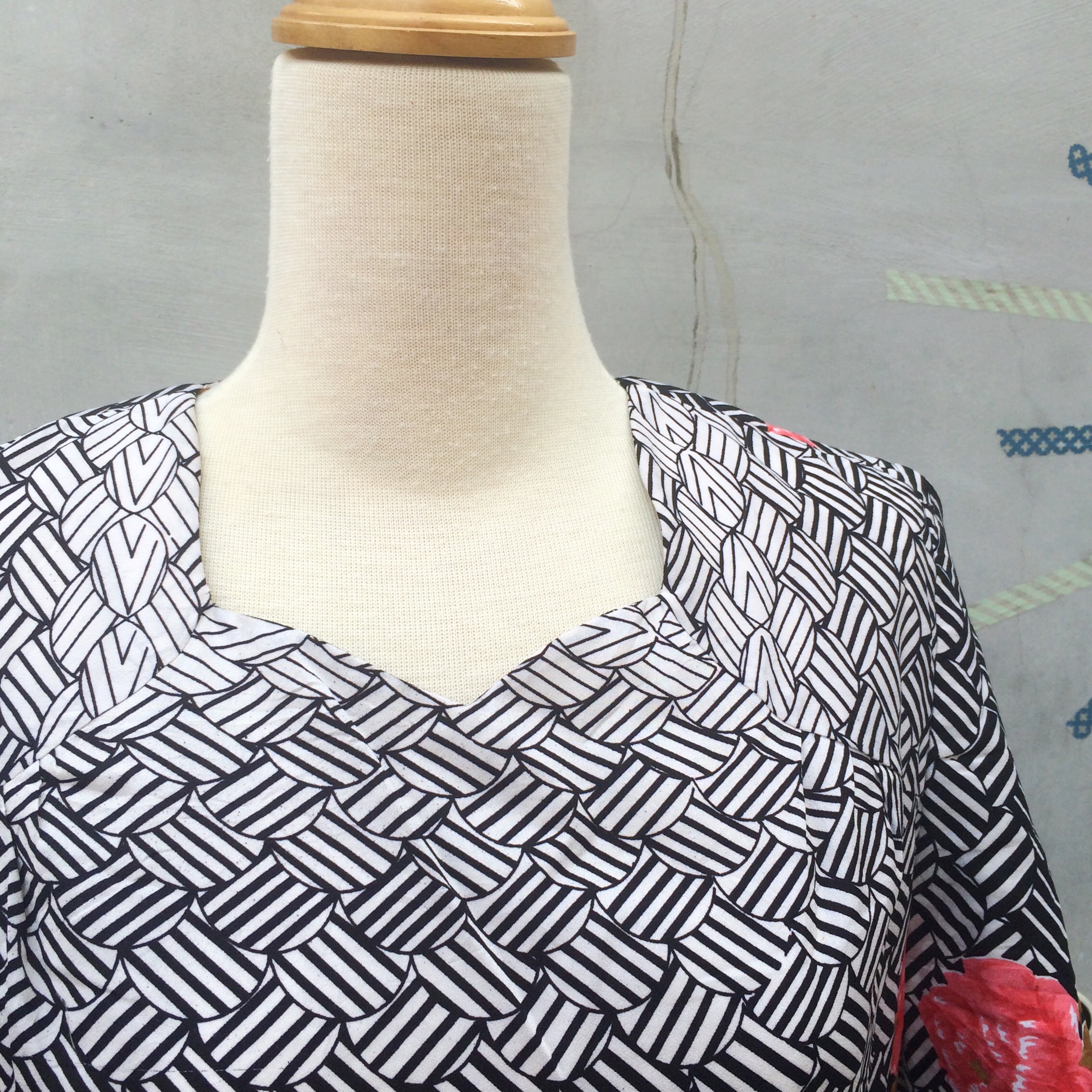 This time, it’s pink roses on black and white striped scallop patterns. Love scallops! And it comes with a beautiful neckline too.