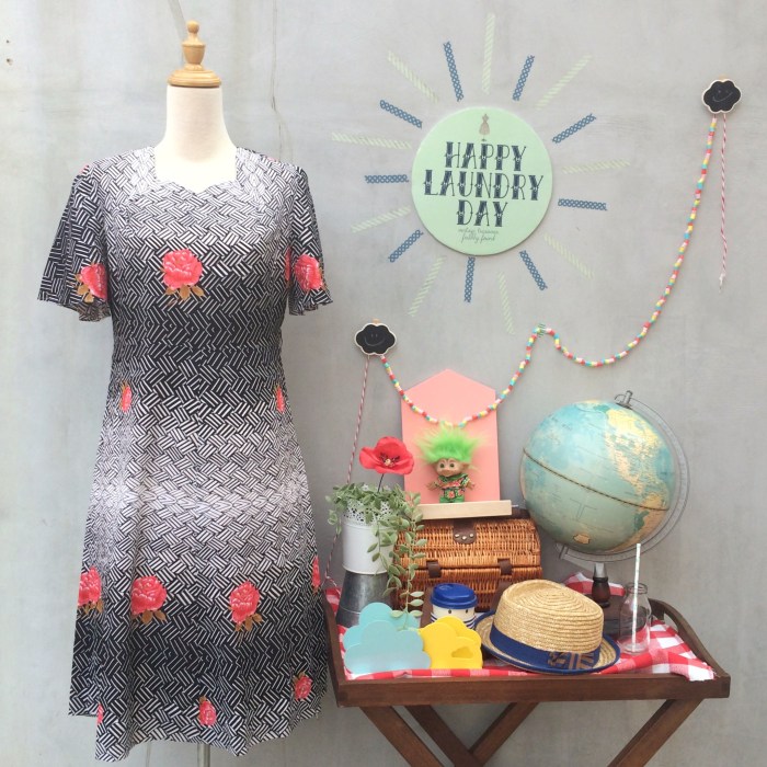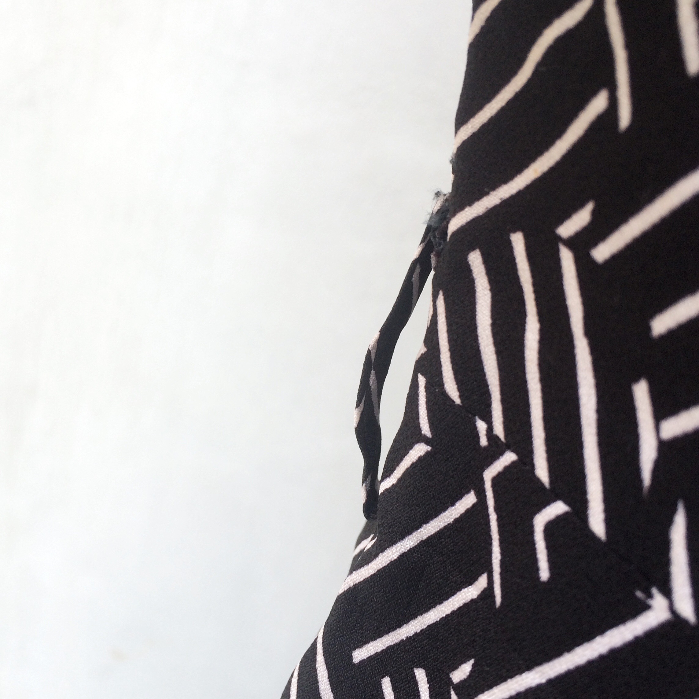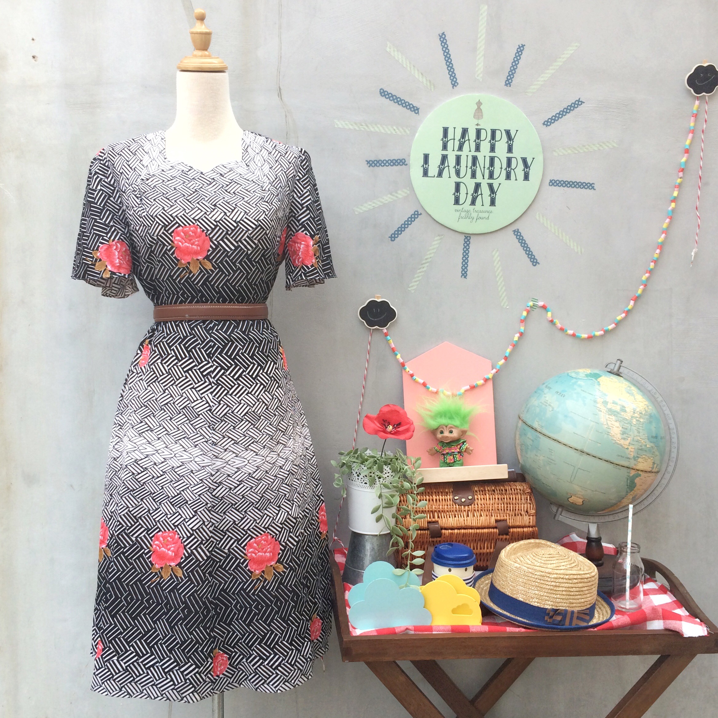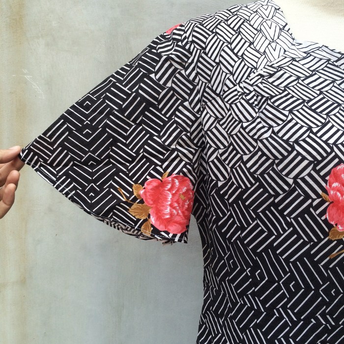 This time, it’s pink roses on black and white striped scallop patterns. Love scallops! And it comes with a beautiful neckline too.