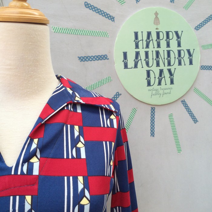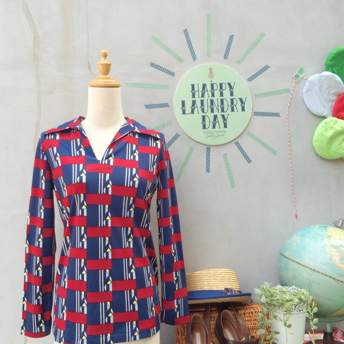 This 1960s 1970s geometric art-deco print long-sleeve top with her pointy collars add just the right about of retro to any modern outfit. Such a good colour combination with that dark navy blue and red/almost-maroon base which allows the light yellow and blue to really pop!
