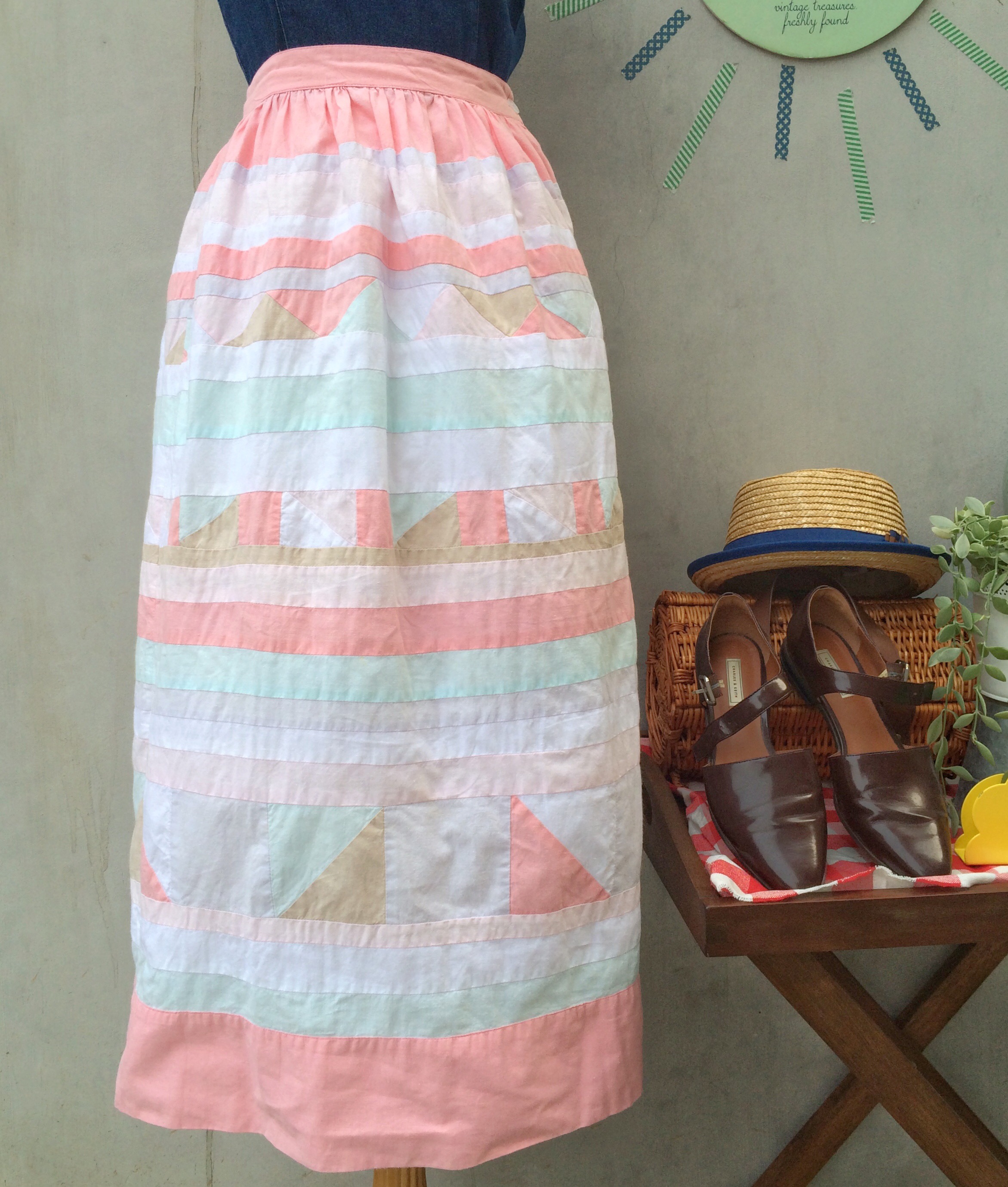 Patchwork without looking home-crafty. It actually is boutique-made we believe, with such carefully planned and designed shapes panels in the loveliest light mint, pink, tan and cream.