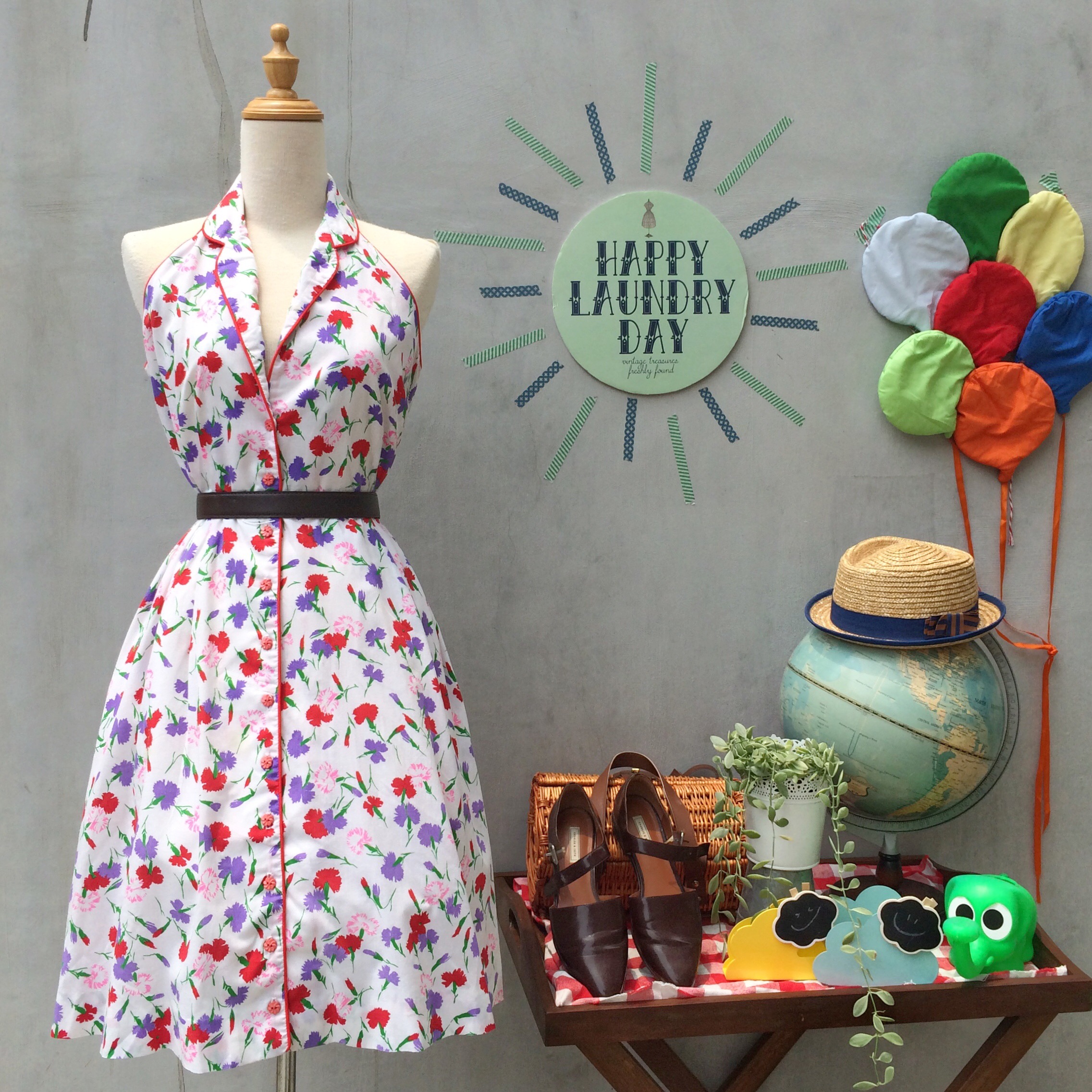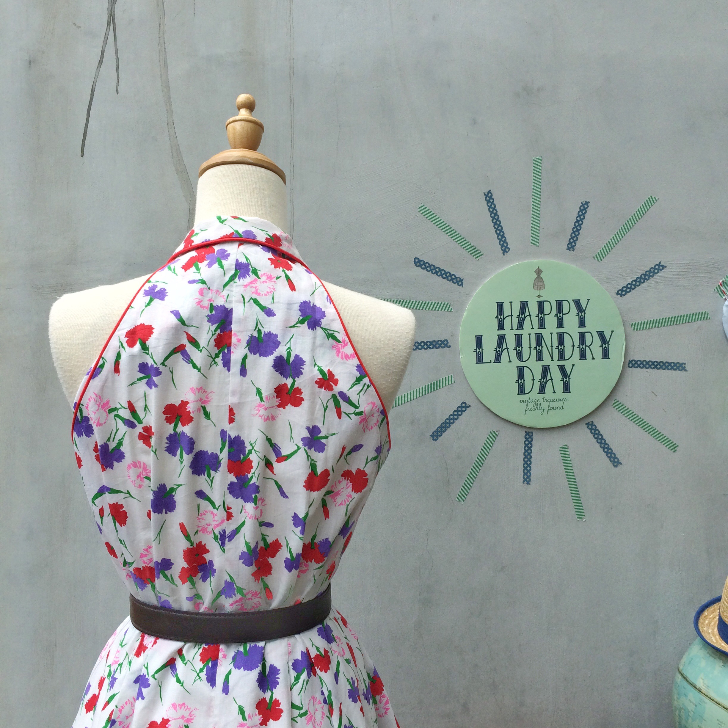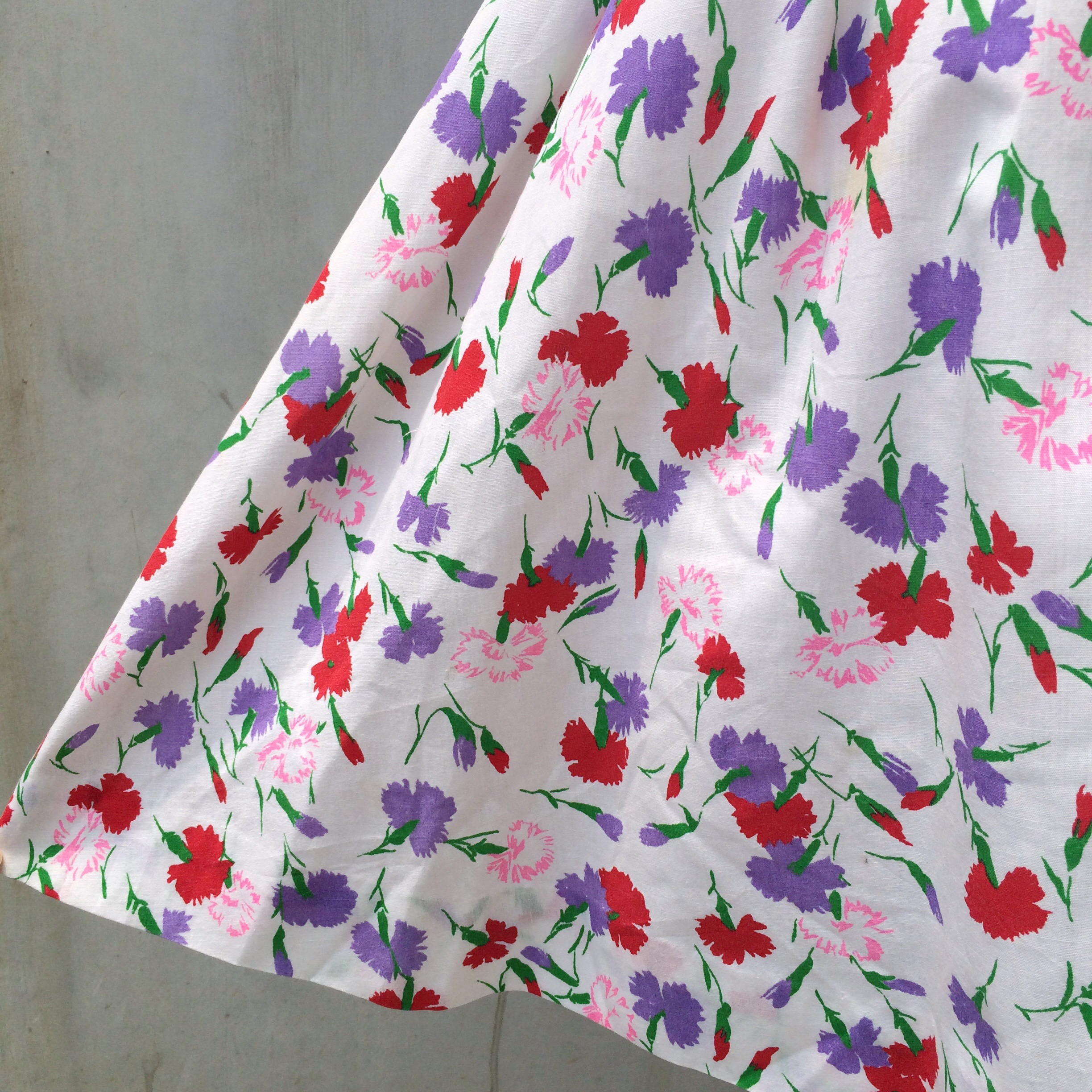 The red piping on this little beauty is really well-done. It somehow ties the fun pink carnation (how often do you get that? π print together. And the pink floral buttons are in such good condition and compliments the dress so well!