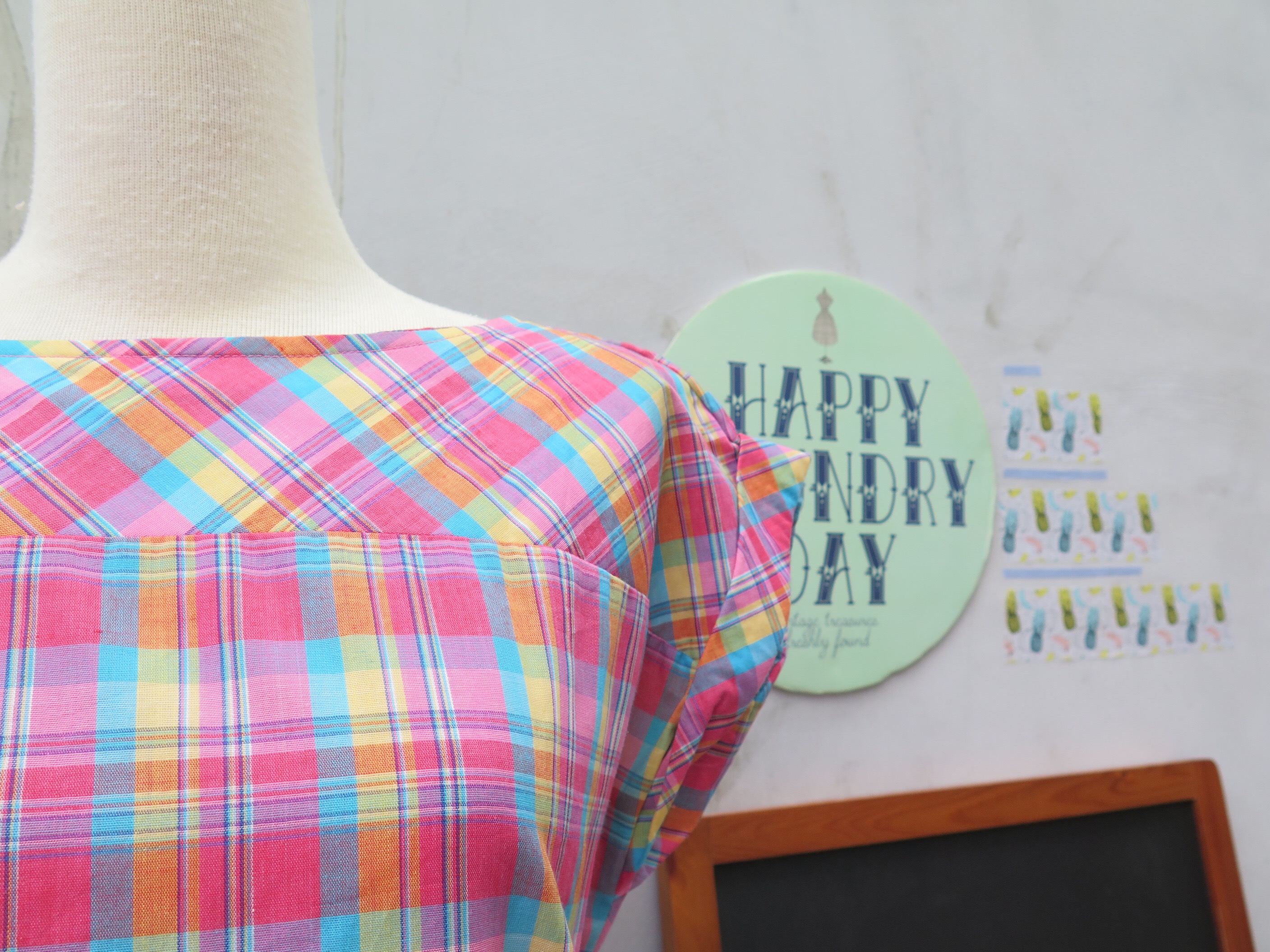 This one is an especially happy one! With its cute color combo, easy loose-fit style and rolled cuffs. We like how the yoked collar area has the fabric cut on a different angle/grain to create just that little bit of contrast.