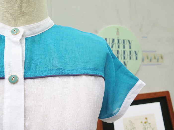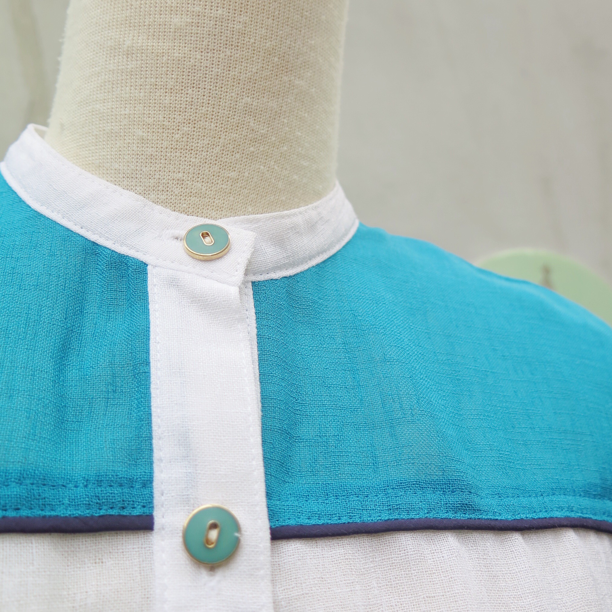 Perhaps it’s the way they are blocked, and the elegant mandarin collar, the neatest dark-blue piping and the loveliest green buttons 🙂