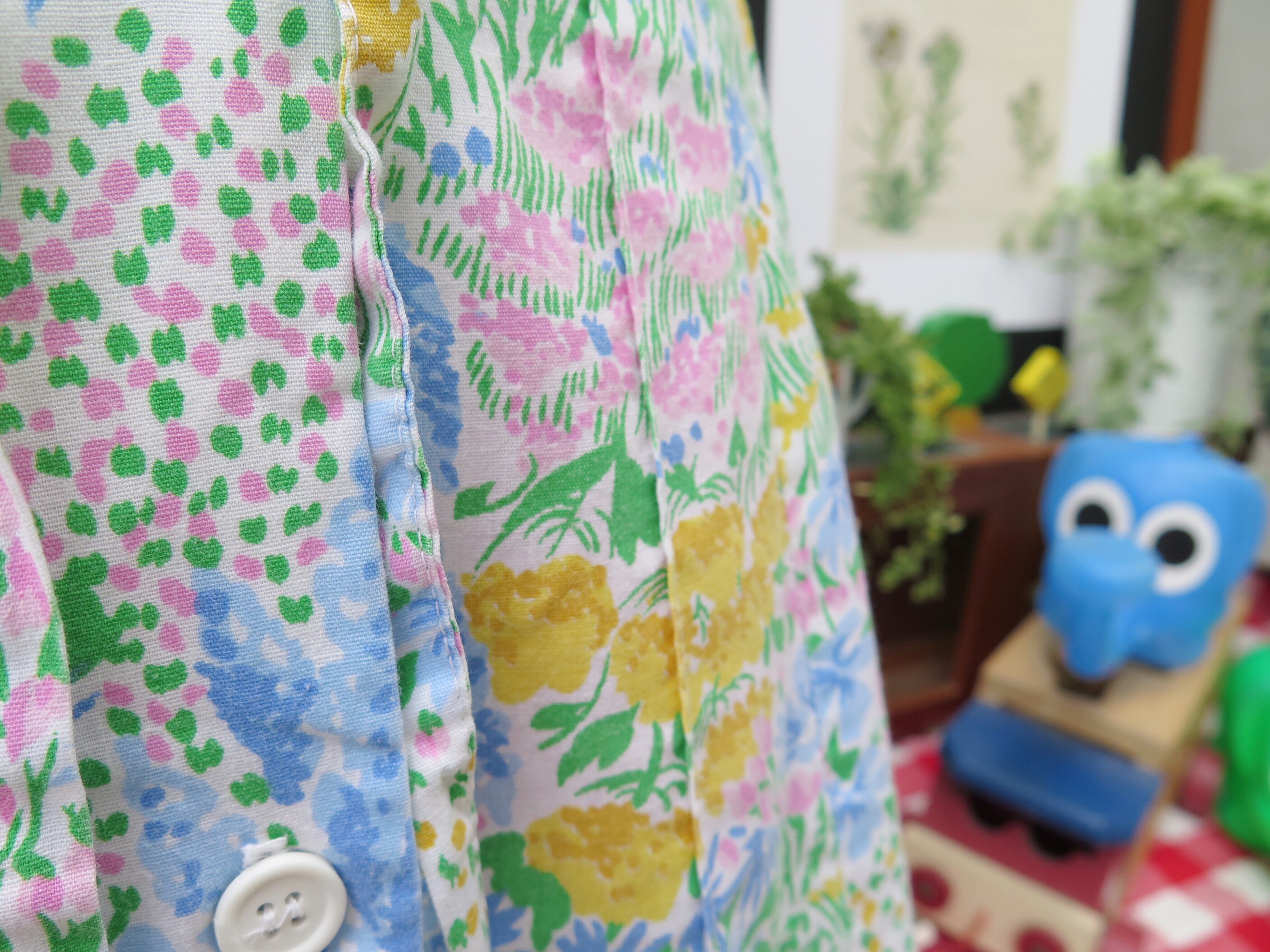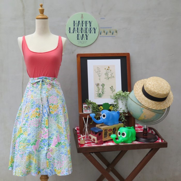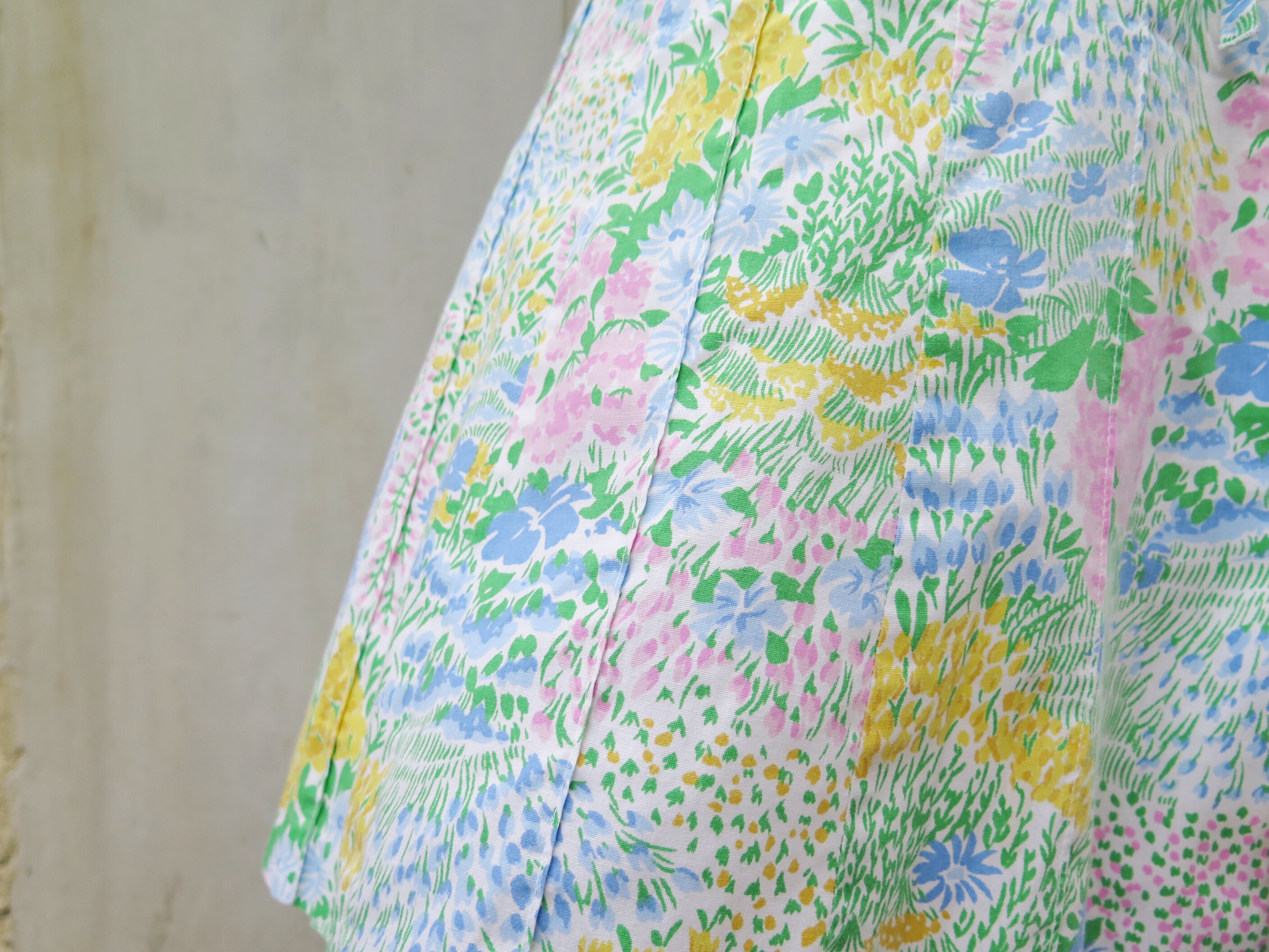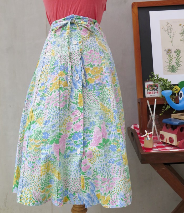 This gently happy, spring floral prints on this rare Herman Geist complete button-down drawstring skirt could very well be the Zeitgeist of the 70s. Full of life, free-spirited and happy. Speaking of peace and not war.