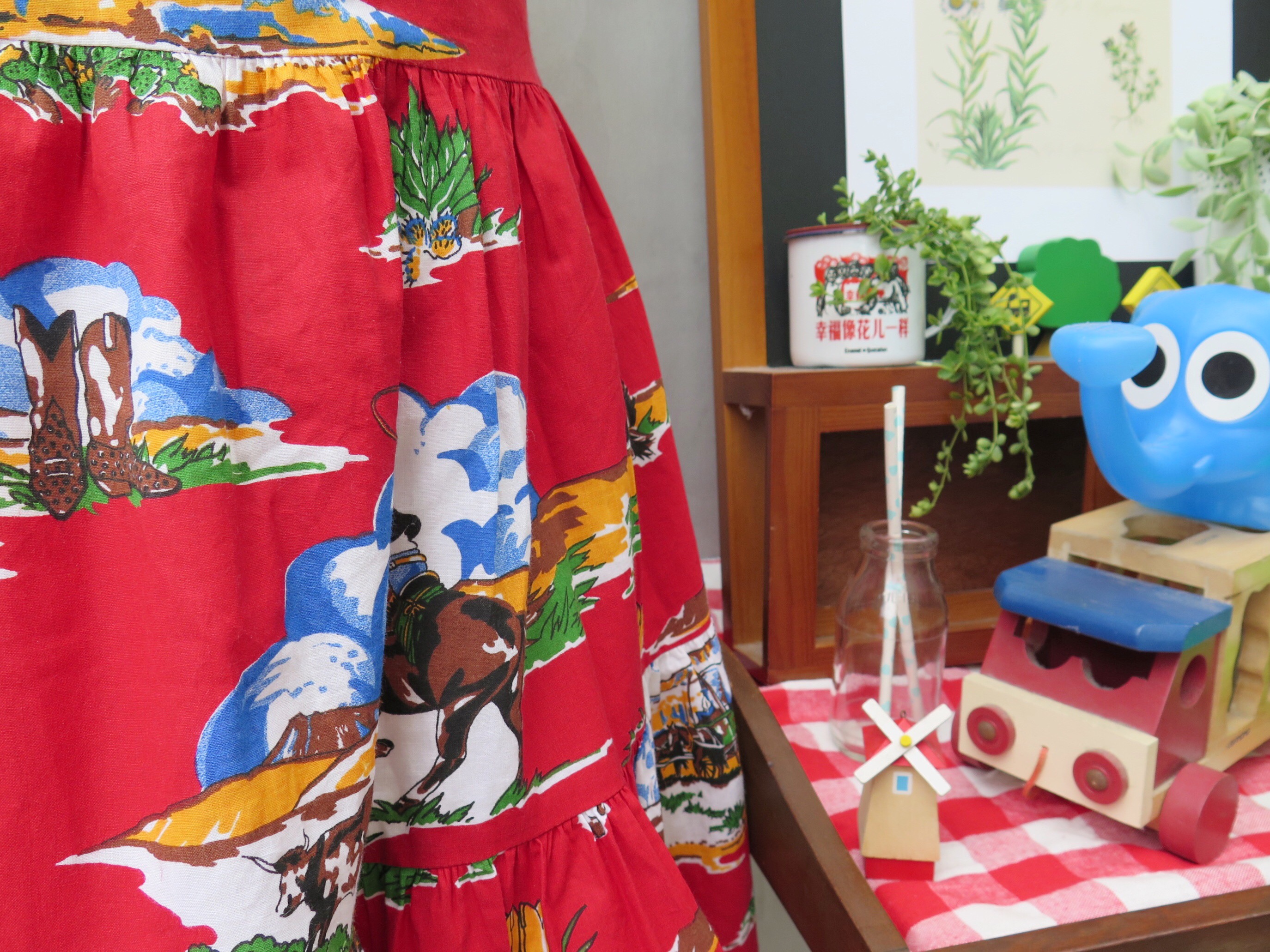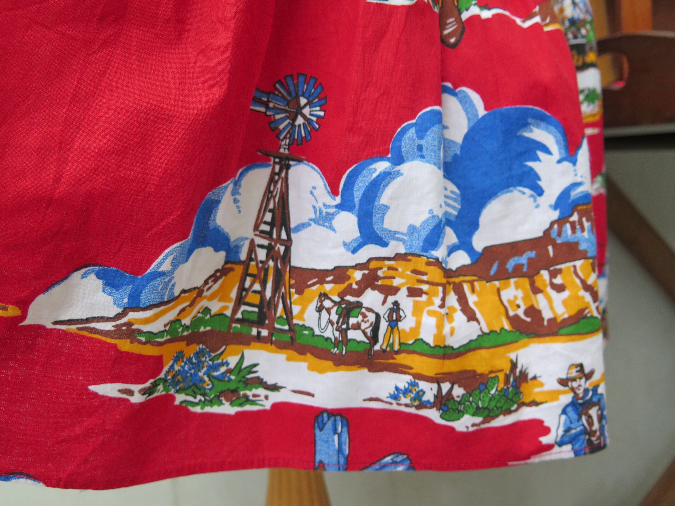 Novelty skirt score! We love the Old Western kitschy cowboy scenes on this tiered red skirt. Such a good color, and print! Horses, cowboys (yeehaw!), cacti, wagons…. it’s like the 1800s come alive!