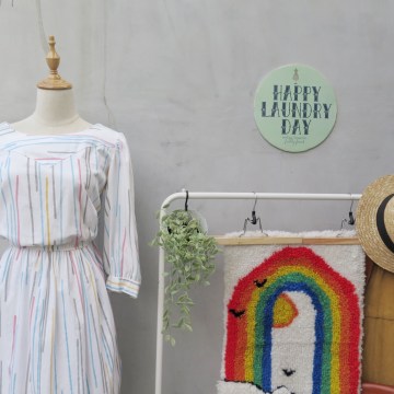 Happy Ning | Vintage 1960s 1970s Multi-colored geometric shape print and stripes Shift Dress