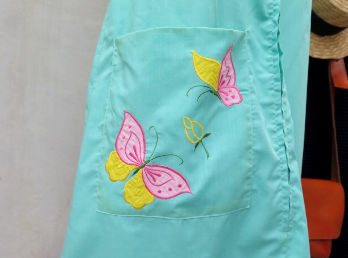 The simple, clean cut is done so well, it’s lightweight and a breeze to wear. One generous square pocket on the right, with a beautifully color-coordinated embroidered appliqué pair of butterflies.