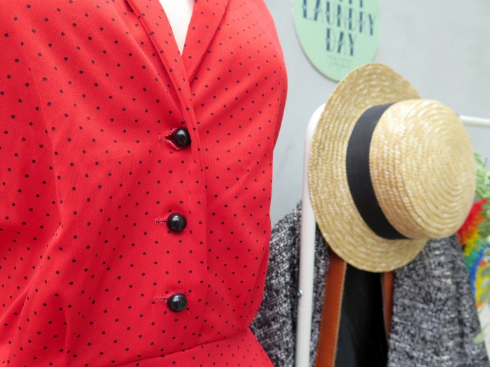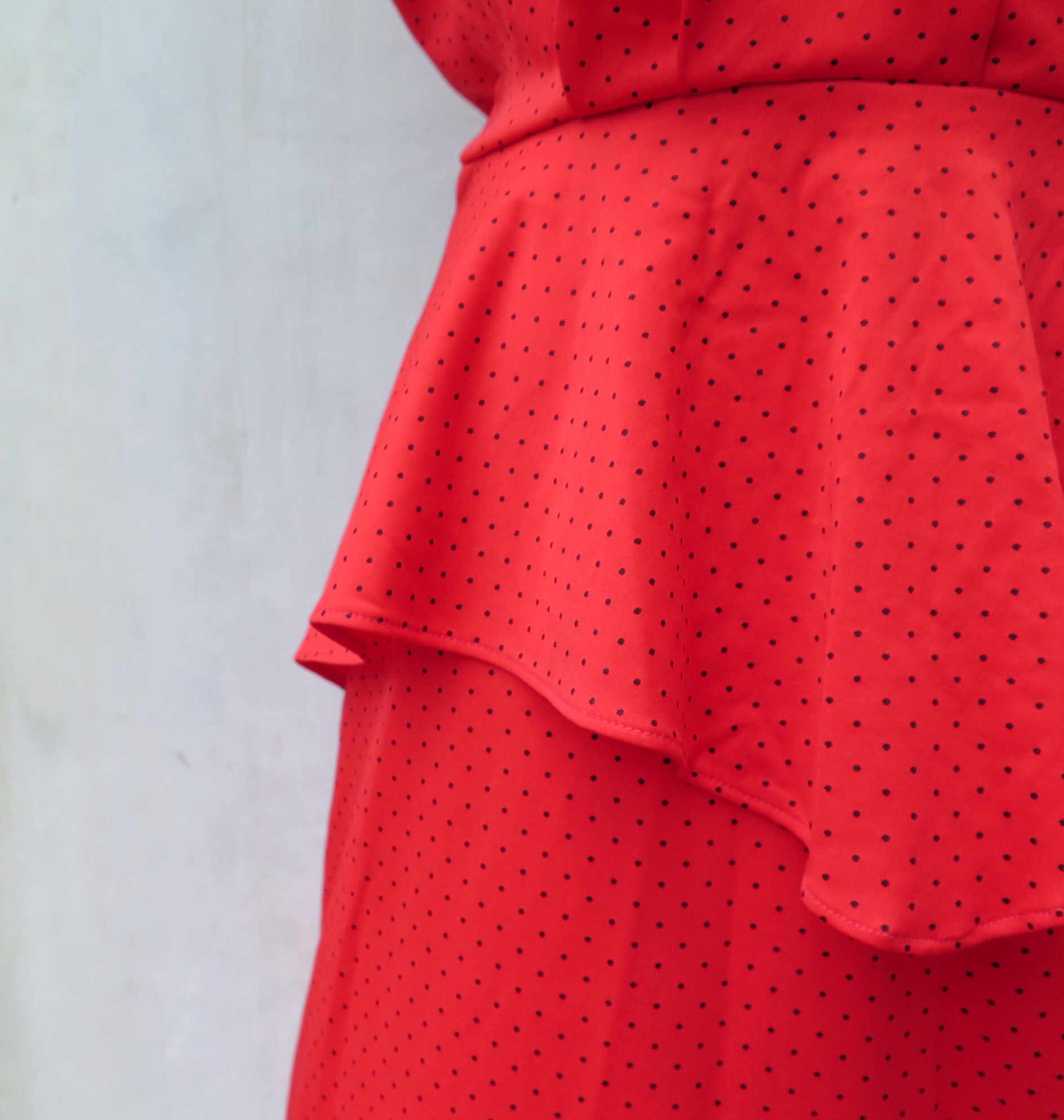 This red & black polka dot peplum top dress reminds of the 1940s, of a femme fatale sort with black gloves, black pillbox hat, kitten sling backs and a cigarette (with a long, slim cigarette holder – a must!) and hair waves that say everything.