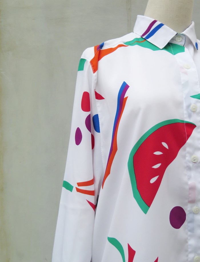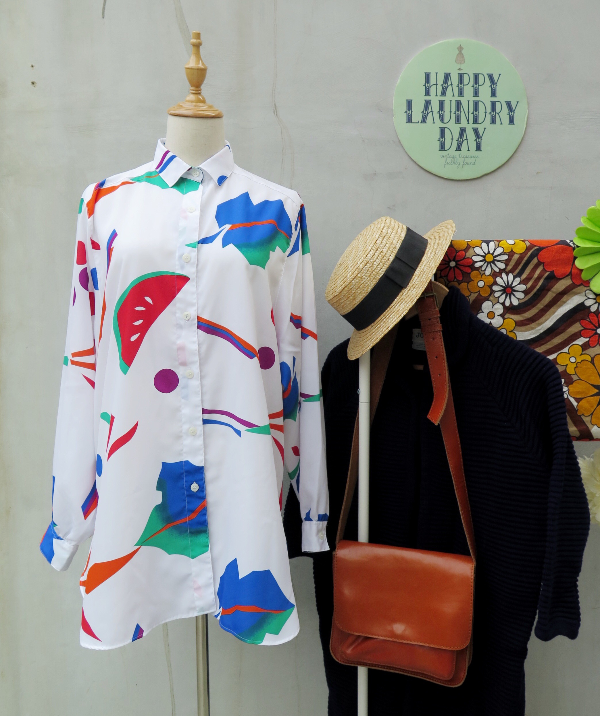 Big comfy pieces are all the rage now, and we like how this loose oversized shirt could very well be worn as a short dress or a long top, with a generous sprinkling of happy colored shapes!