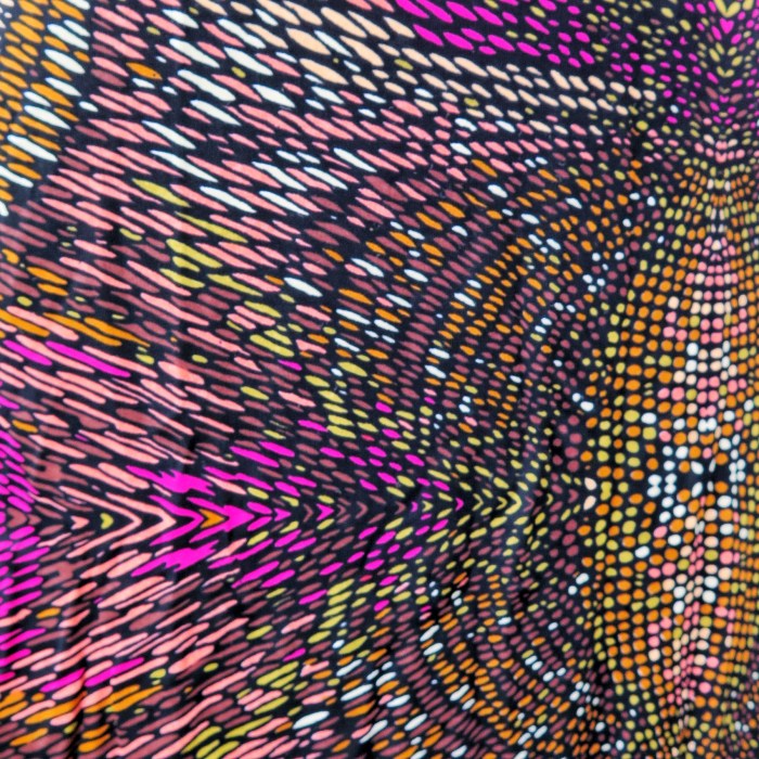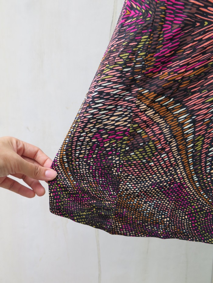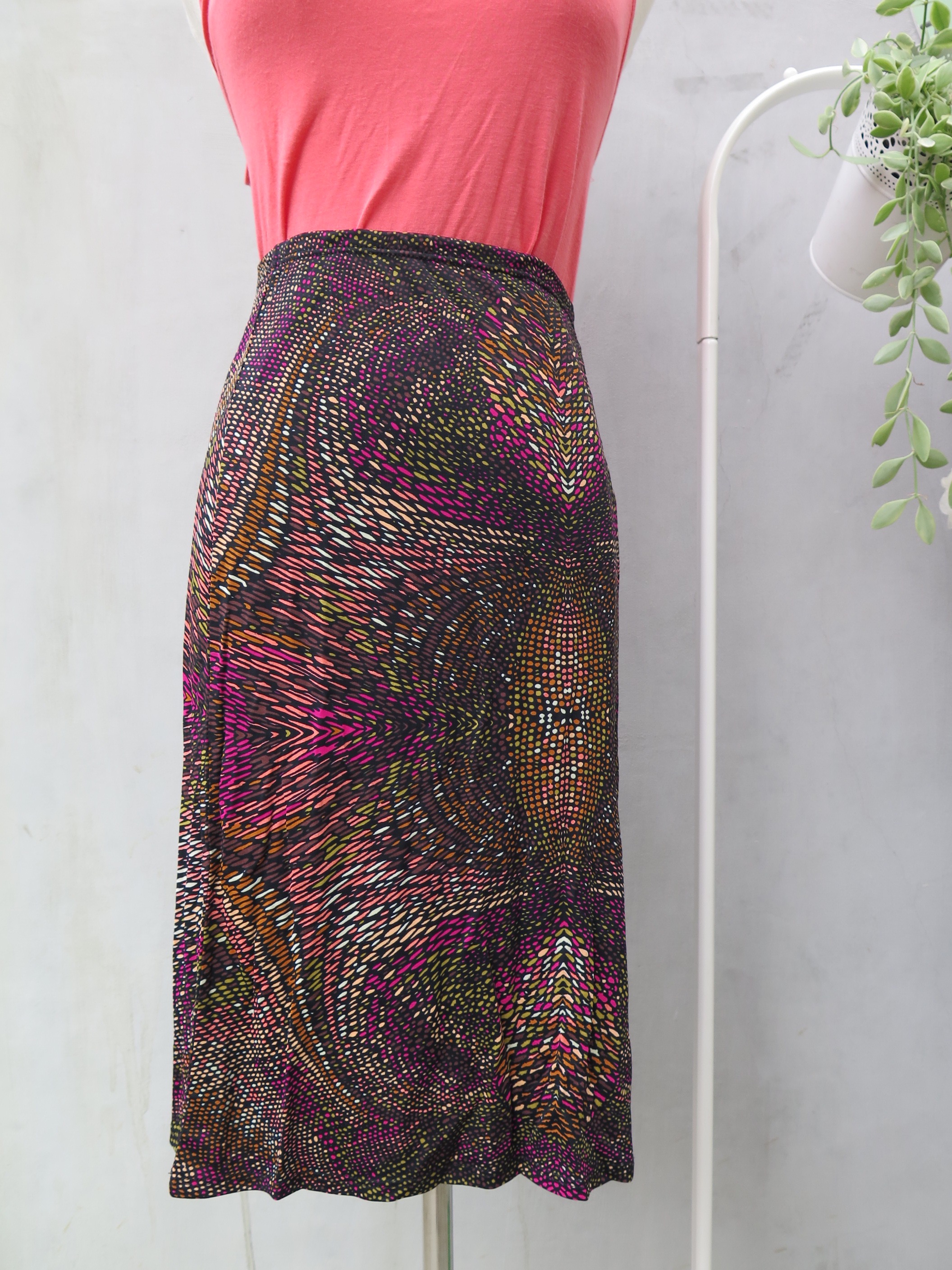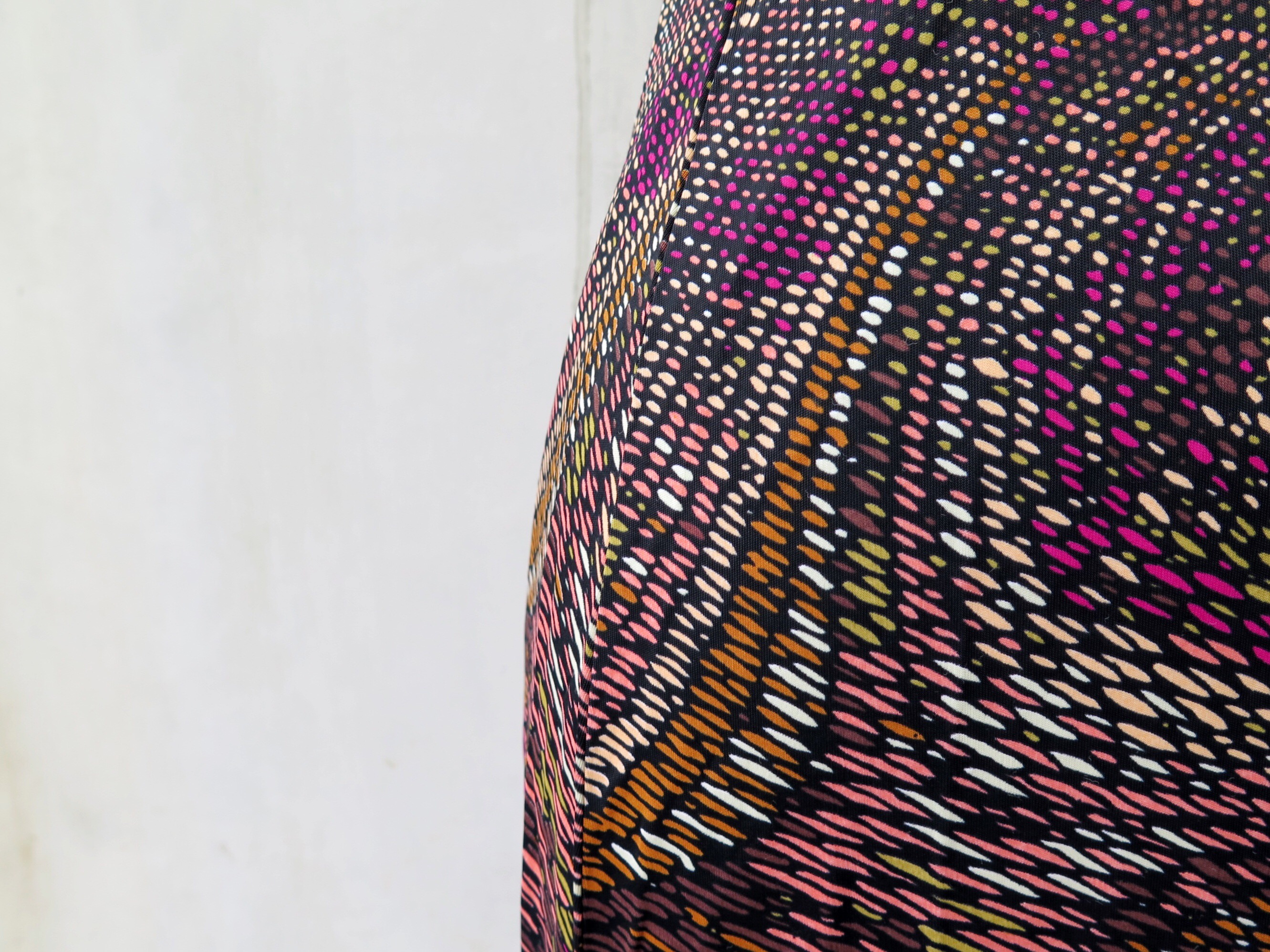 The smoothest, slinkiest fabric of this 1970s/80s mini skirt (not too mini though, so still quite a lot of coverage 😉 skirt compliments the retro, psychedelic-print so well.