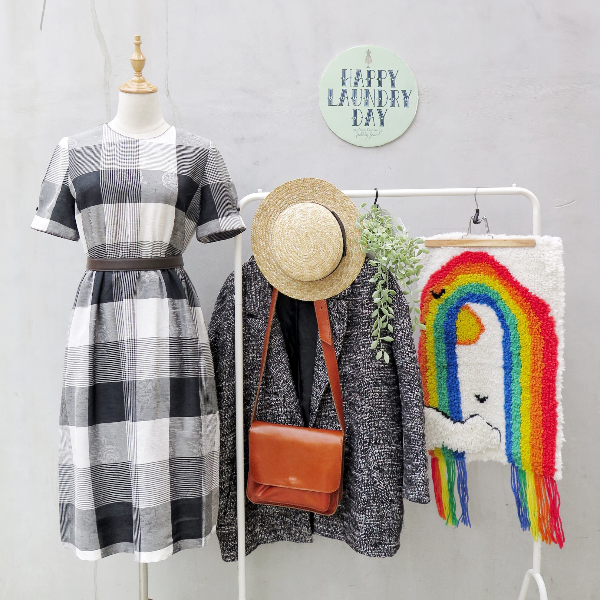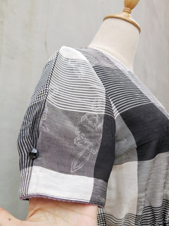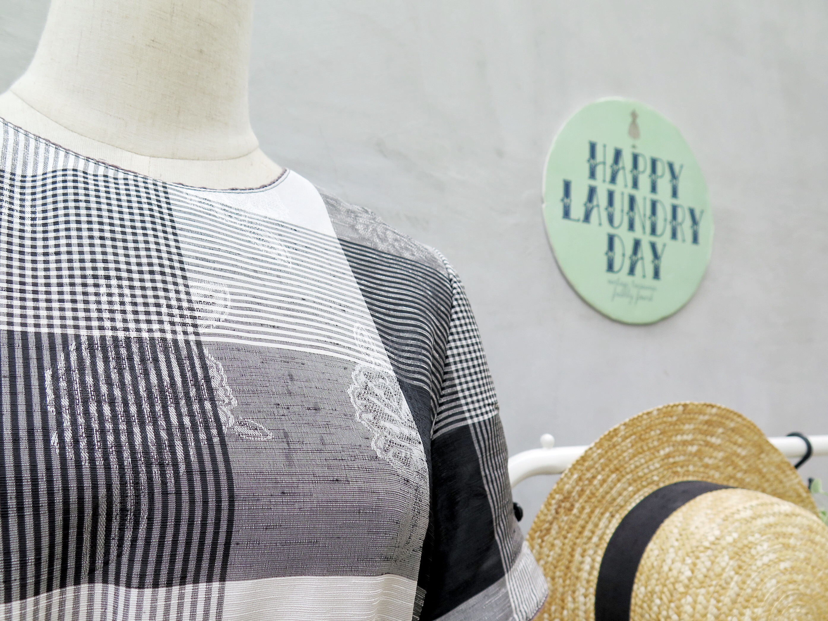 A simple black and white grid-print dress in big checks. Not just that. This has subtly glimmering embossed rose prints that speaks of the details of vintage garments.
