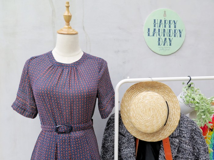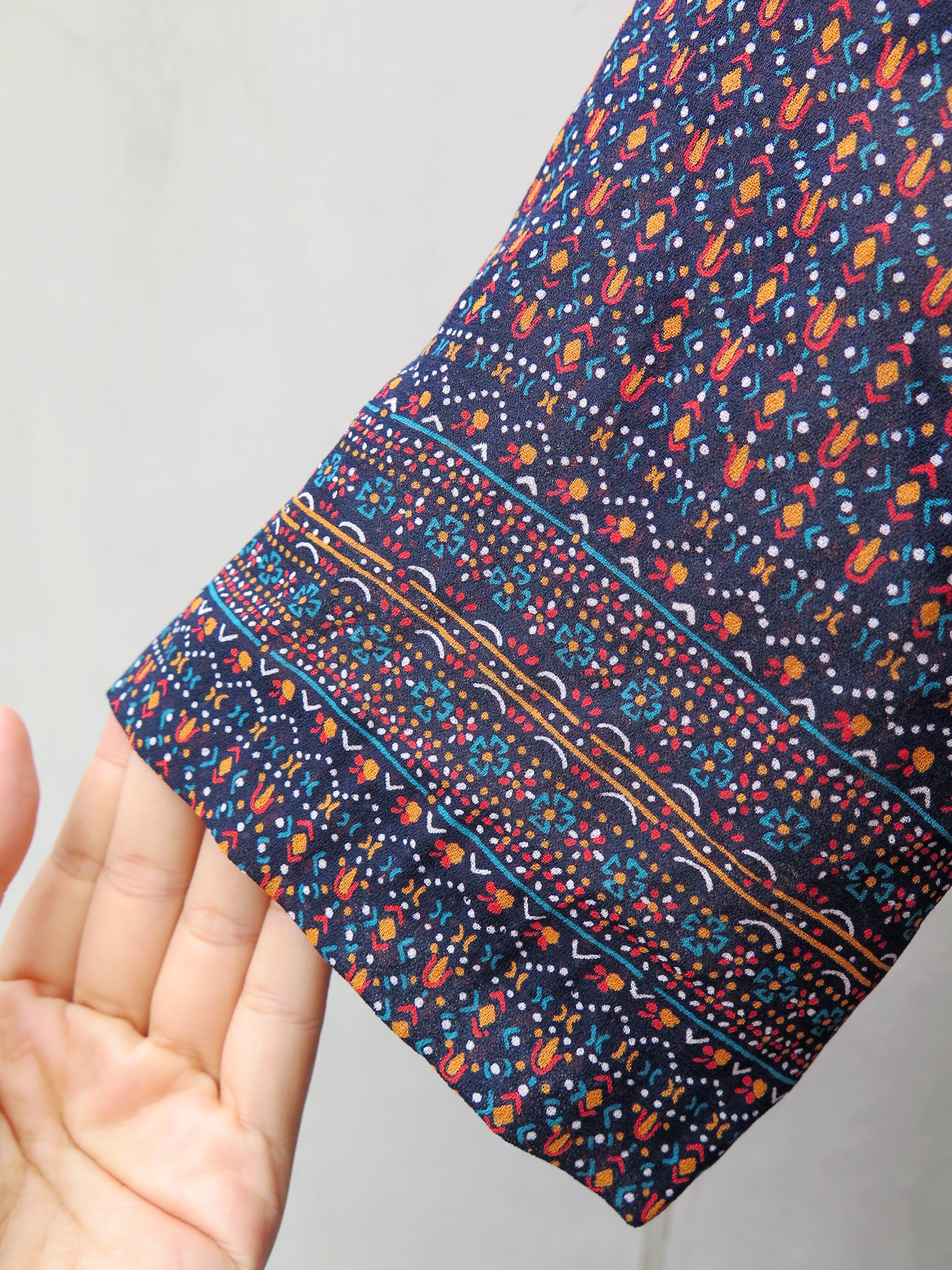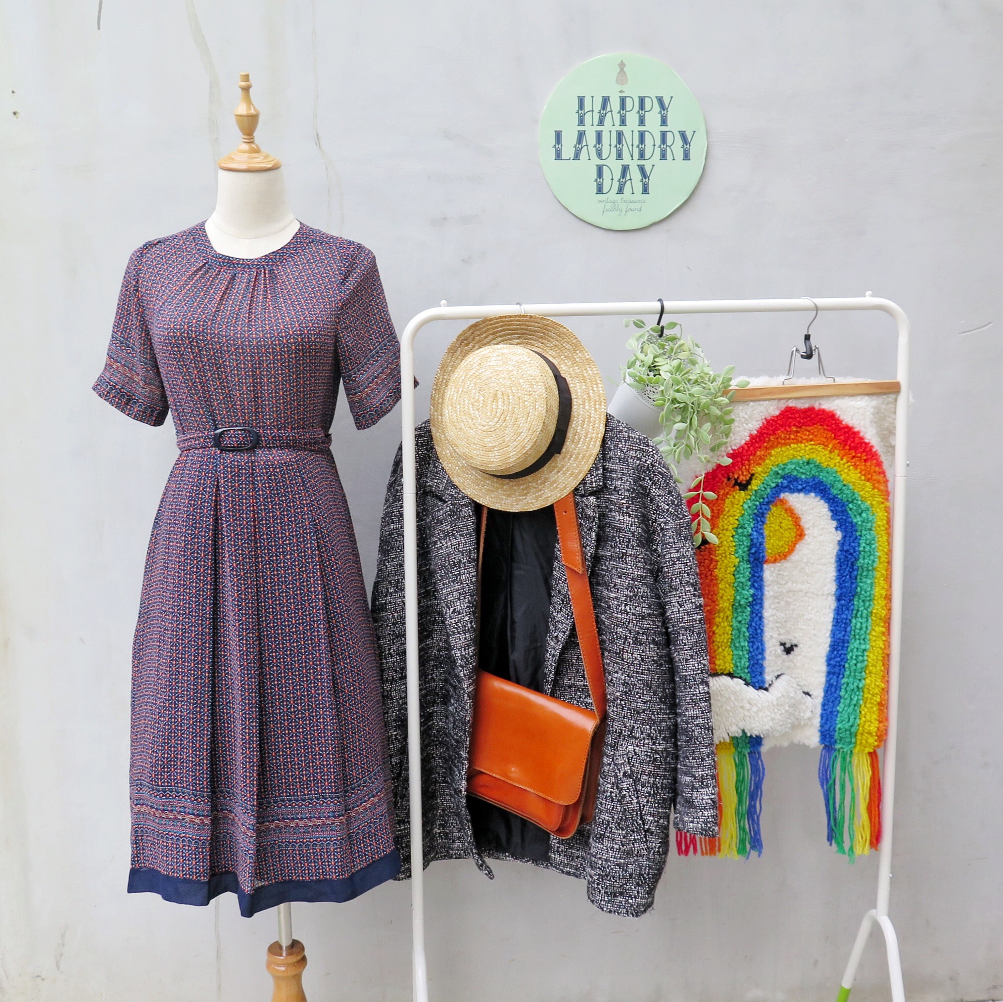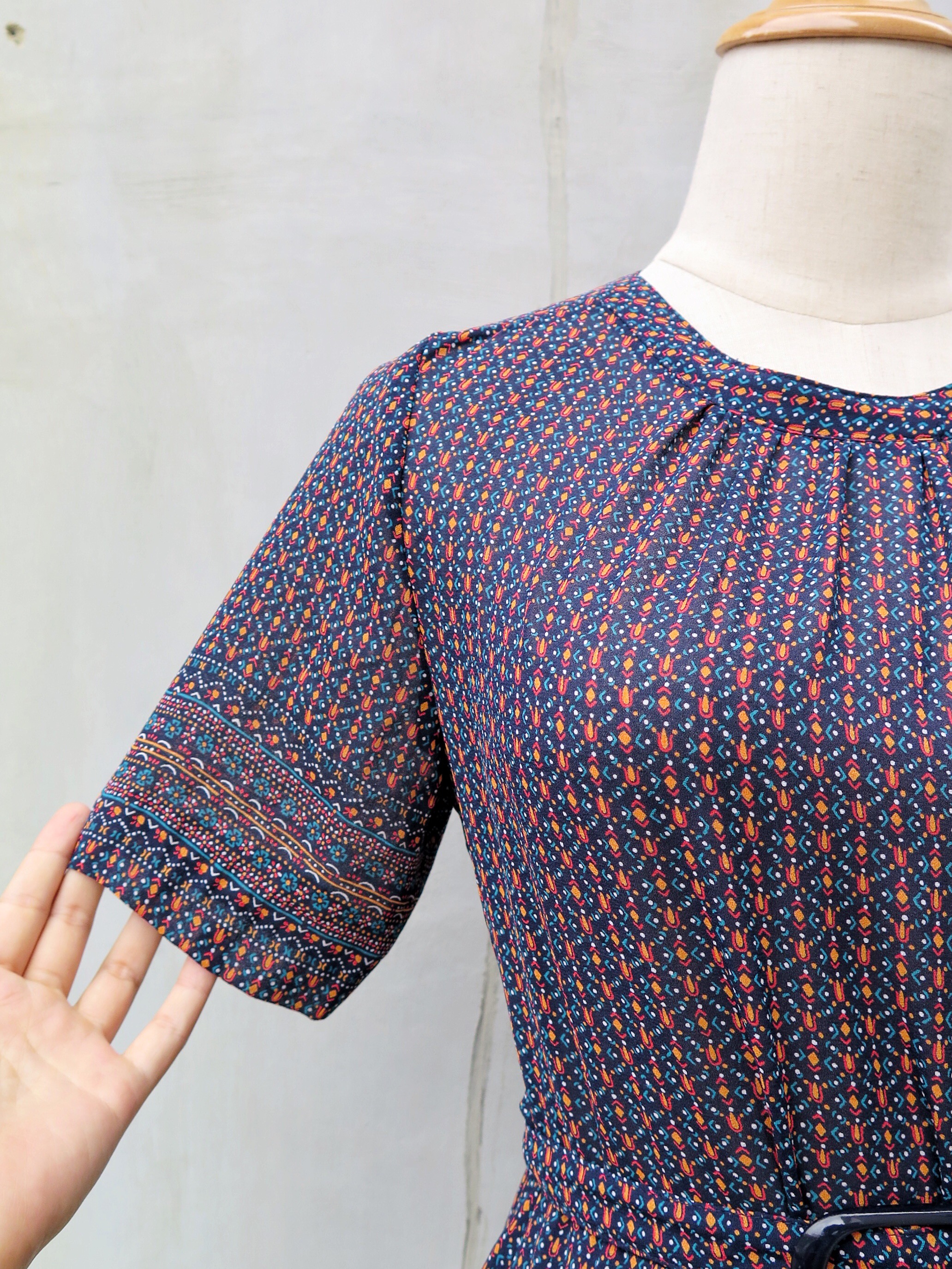This navy blue dress with her pretty silhouette and most adorable tiny floral and patterned prints comes with a matching fabric belt and lightest gathered neckline.