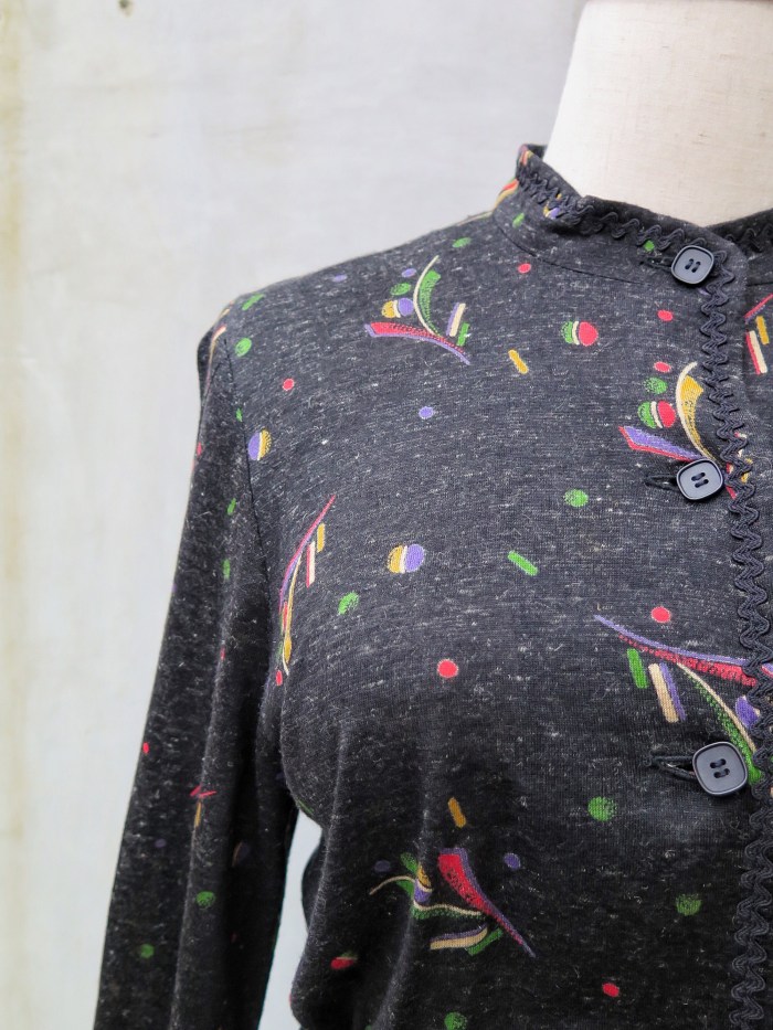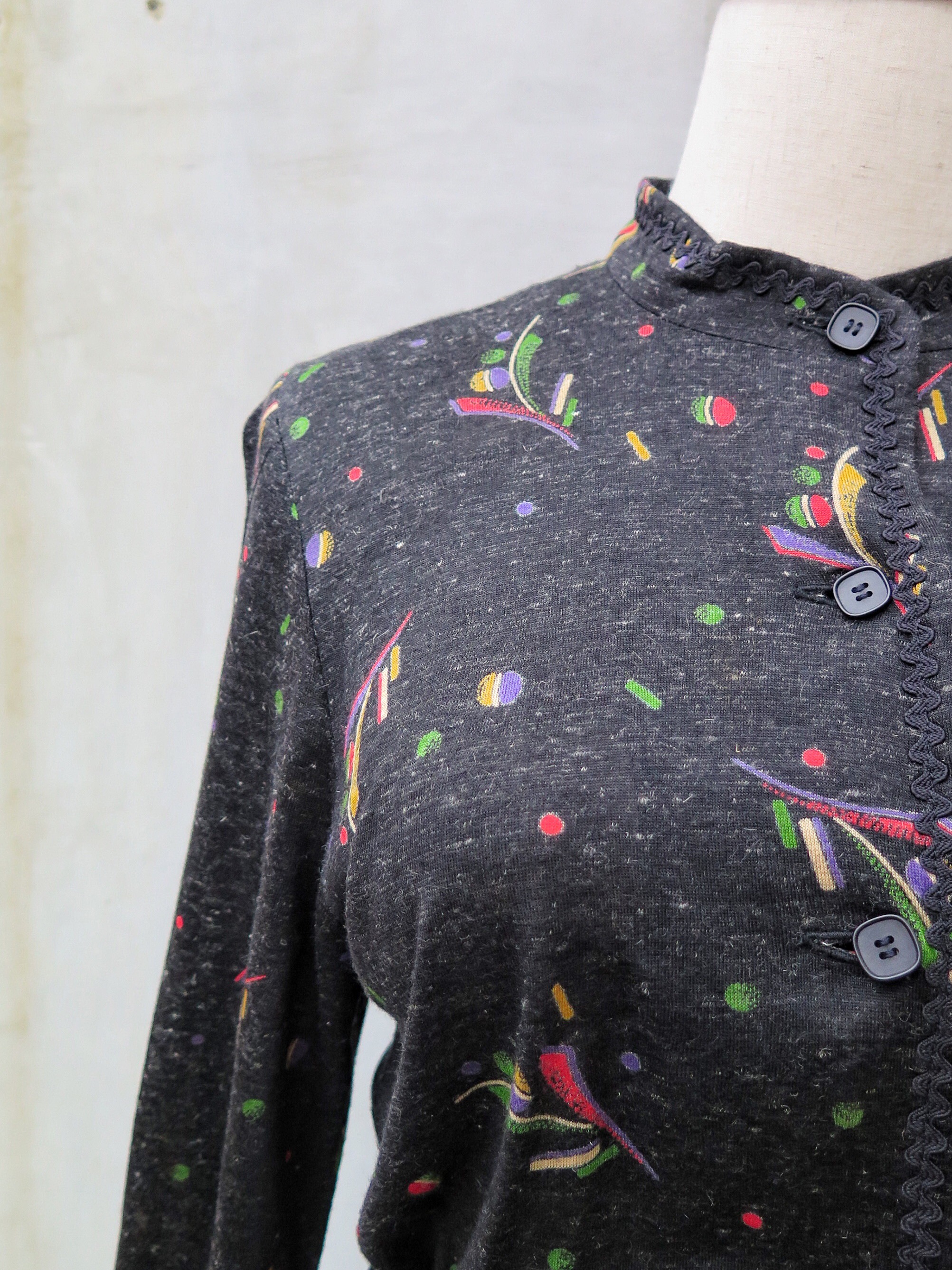 The abstract geometric prints on this textured black (or dark gray) dress makes us think of planets and stars, meeting and then drifting apart in space. A space so dark yet so brightly lit by the strength from the stars in it.
