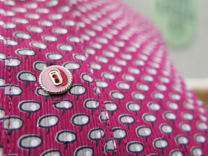 The gorgeous burgundy color of this pleated dress and her white collar work perfectly in giving space for the grey nuclei-like polka dots. Grey and burgundy. Why have we never thought of that!