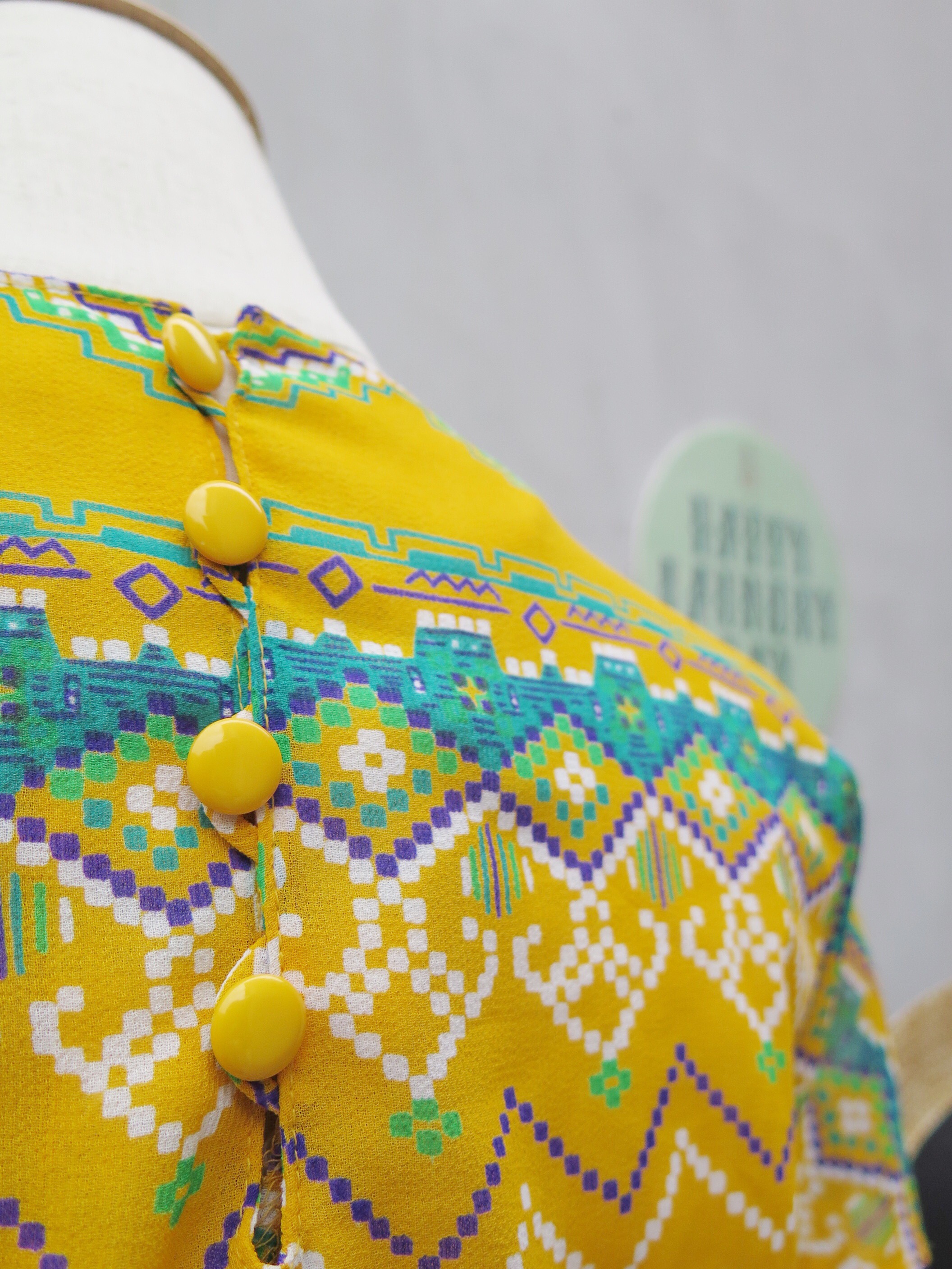 What a pretty little thing this is. Her delicate form. Her lightweight, chiffon-like fabric. Her vintage and aztec-inspired print. And her row of cute little m&m buttons down the back of the neck.
