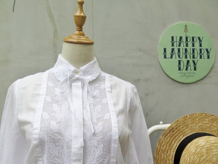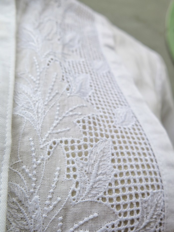 And this is chock-a-block with details. From scalloped collar, to white little ribbon neck-tie, to open latticework lace panels to white floral and leaf motif embroidery.