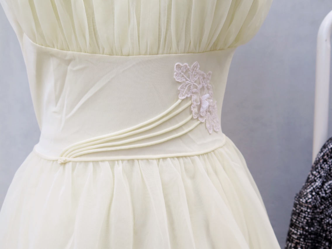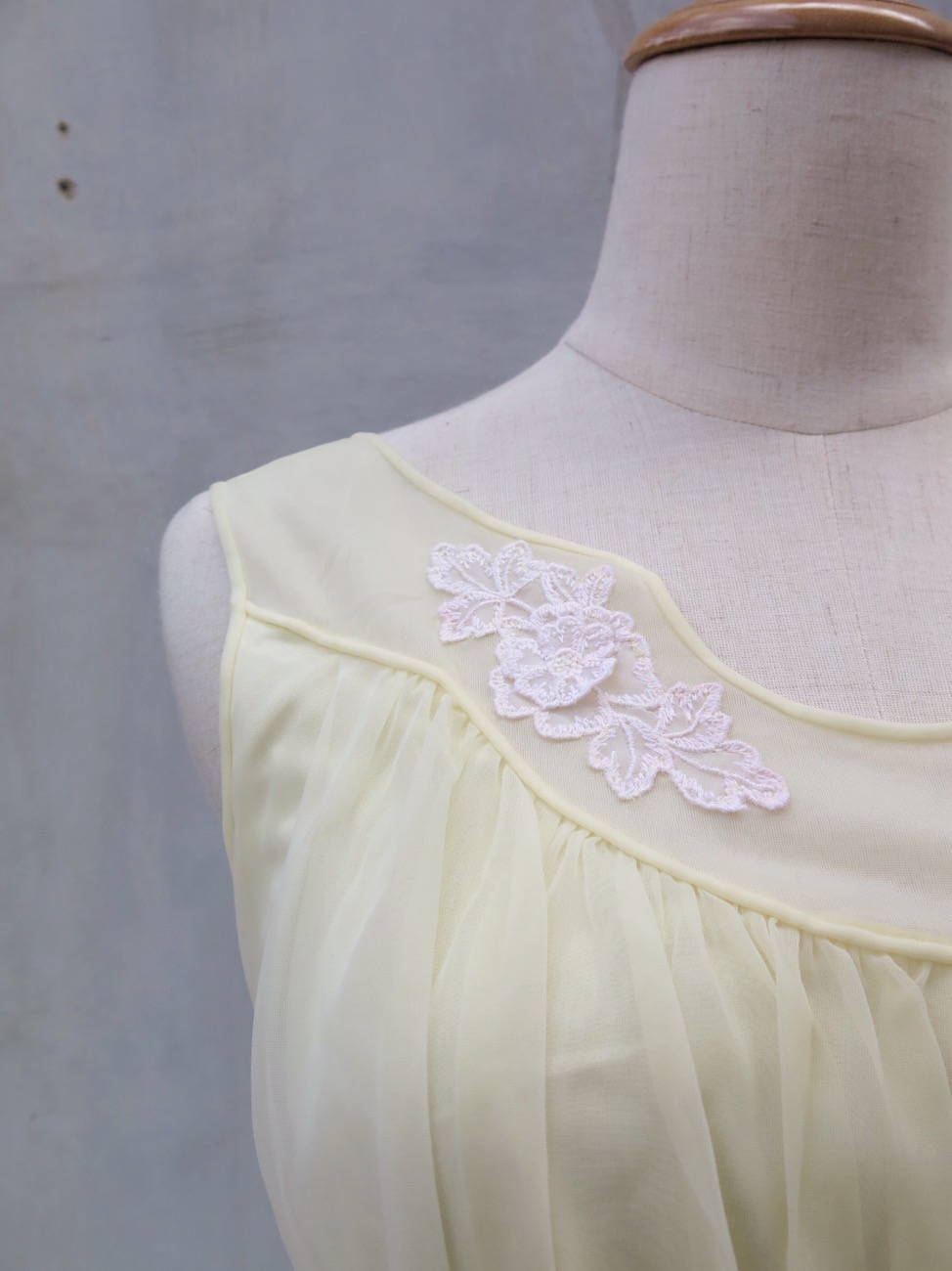 We think this light lemon yellow, gauzy chiffon dress with her lace accents – like little flower petals floating down from treetops and sun rays seeping through yellowing leaves on a quiet autumn day.
