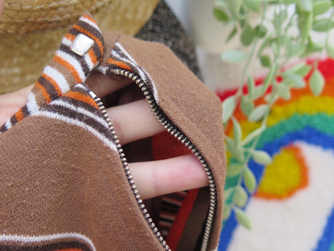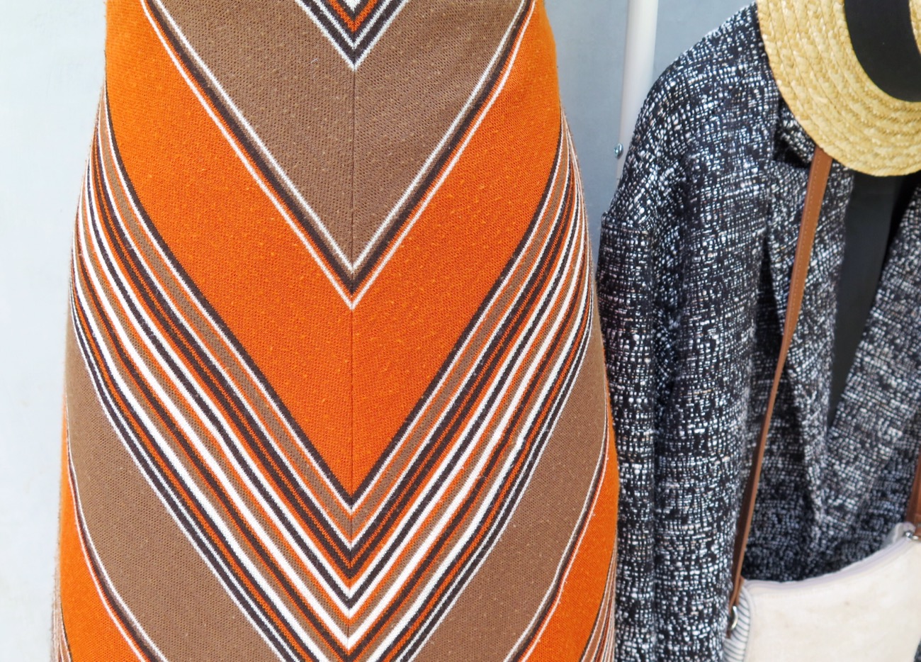 The chevron stripes, the textured fabric, the mix of oranges/browns, the easy A-line silhouette.