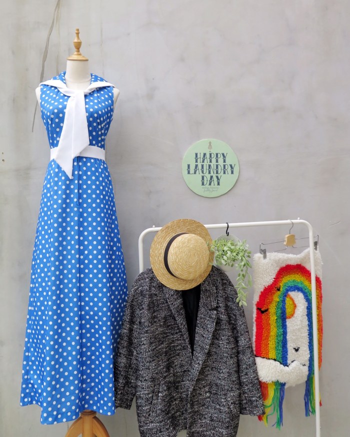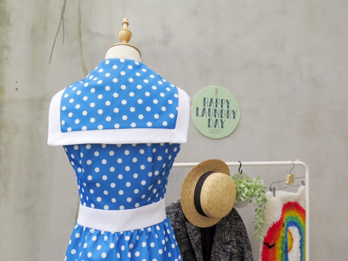 This makes us think of the 1940s/50s, of movie stars sun-basking in dark glasses, red lips, wavy hair kept from blowing completely in the wind in a cute little scarf and the most amazing pantsuits ever. This white/blue polka dot beauty has a nautical sailor collar to boot.