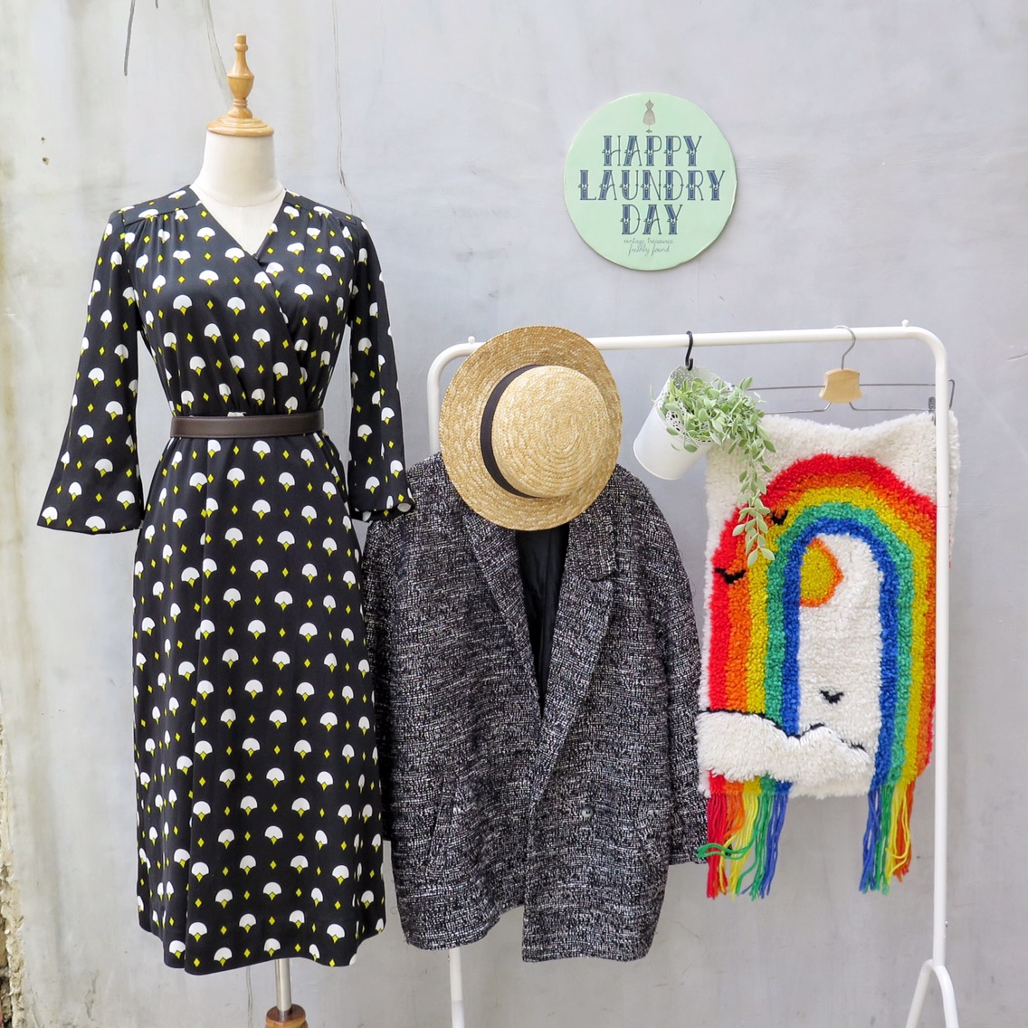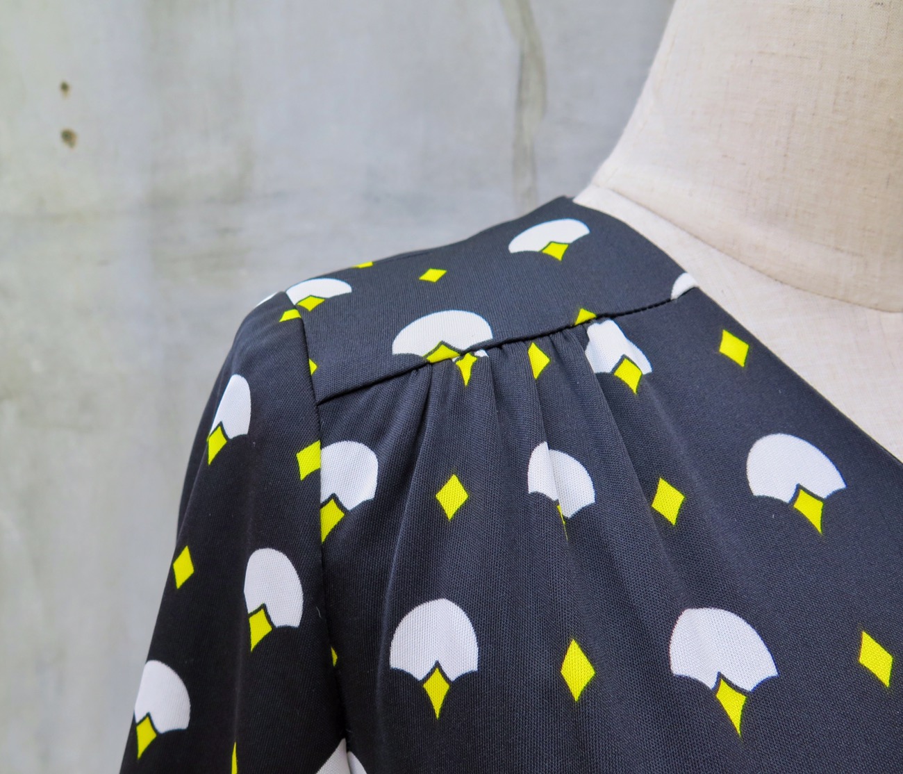 The yellow+white retro geometric prints contrast well with the midnight black of the dress and the way it is cut and opens & closes at the bust is truly genius.