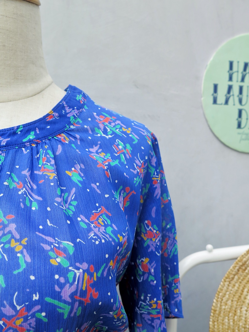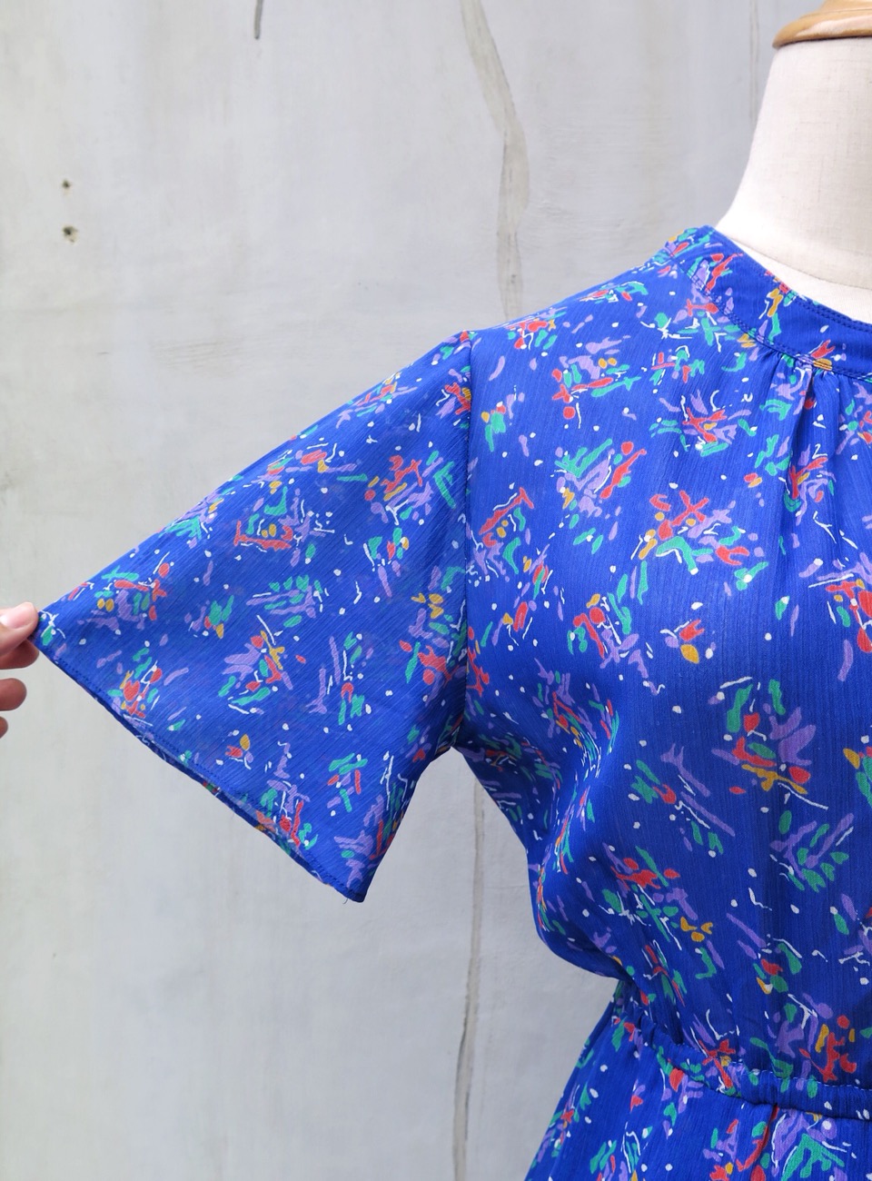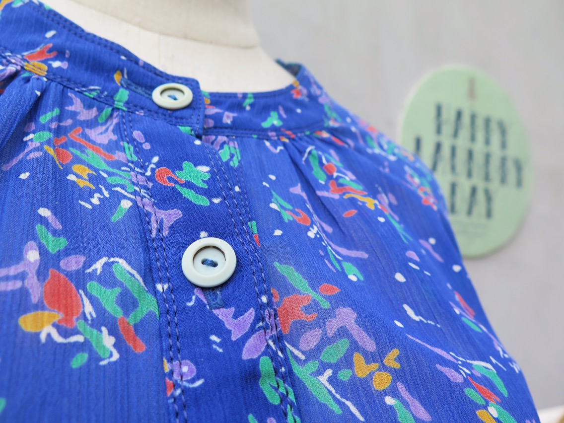 Isn’t just this the sweetest little blue vintage 1960s 1970s day dress? The cheeriest, happiest confetti-like doodle prints with flirty flutter sleeves.