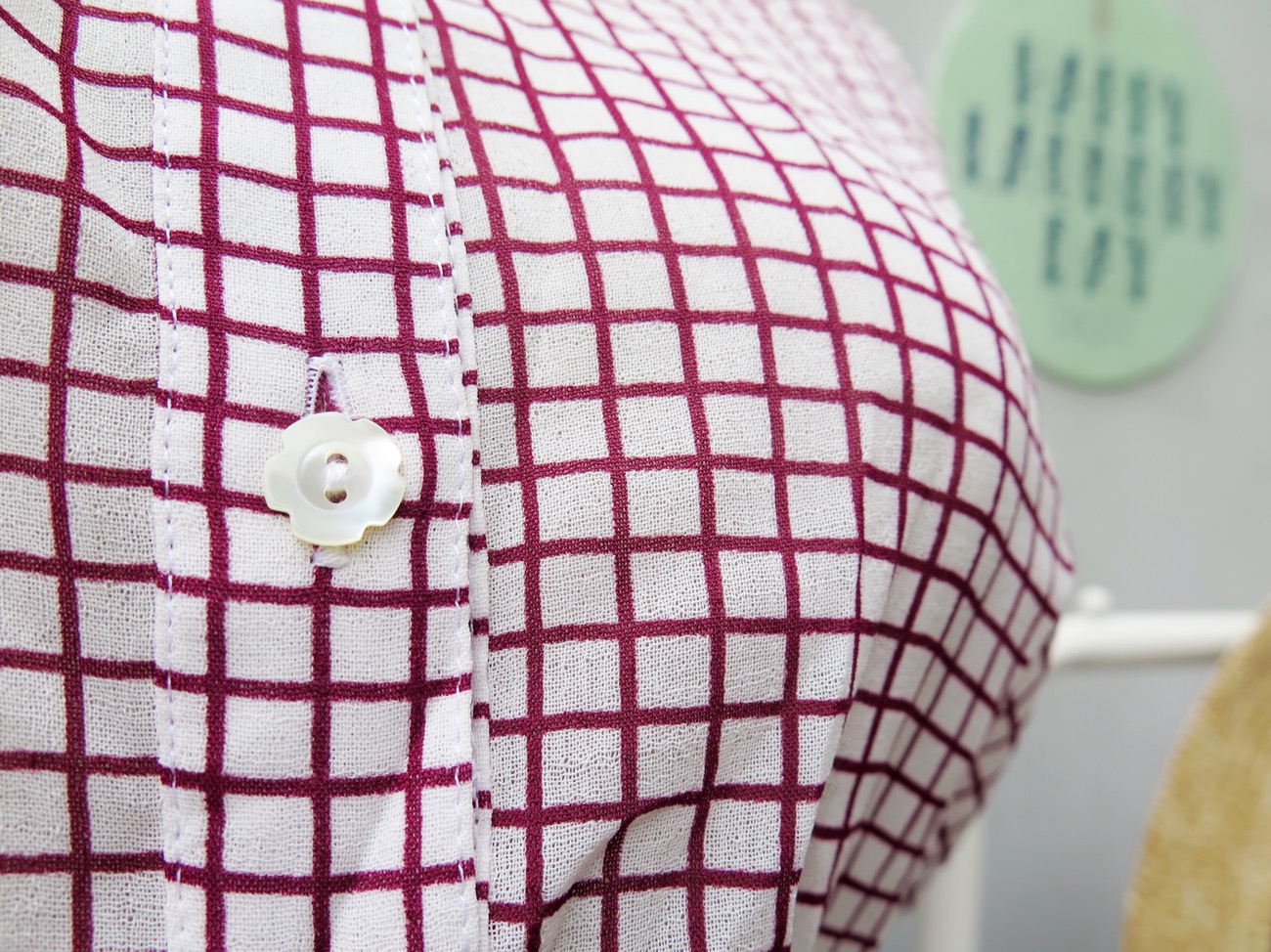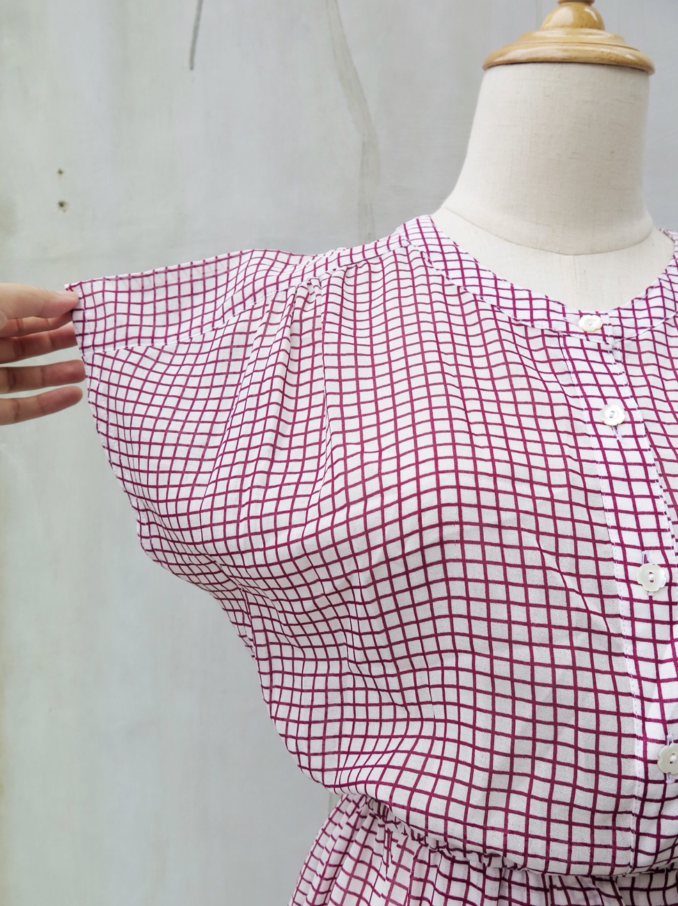 Just like this cute little white and dark cherry red checkered dress with cute semi-cap sleeves and a flat collar. Oh and it also has the most adorable little white flower-shaped buttons all the way down the bust.