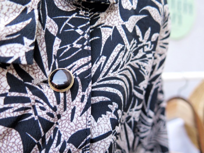 These tropical fern prints in a monochromatic beige and black tames the wildness of a busy print down. And the pussy bow necktie…. don’t be fooled by it. This certainly isn’t for any coy kitty π