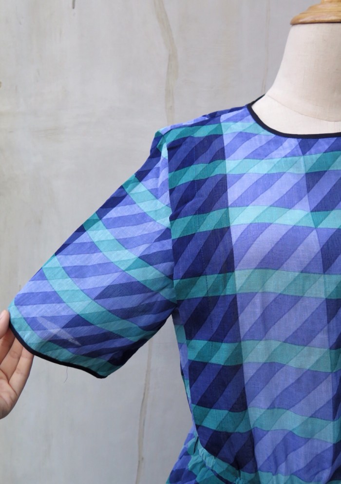We love the ease of this dress and her loose-fit silhouette. The black piping cleverly holds the whole look together!