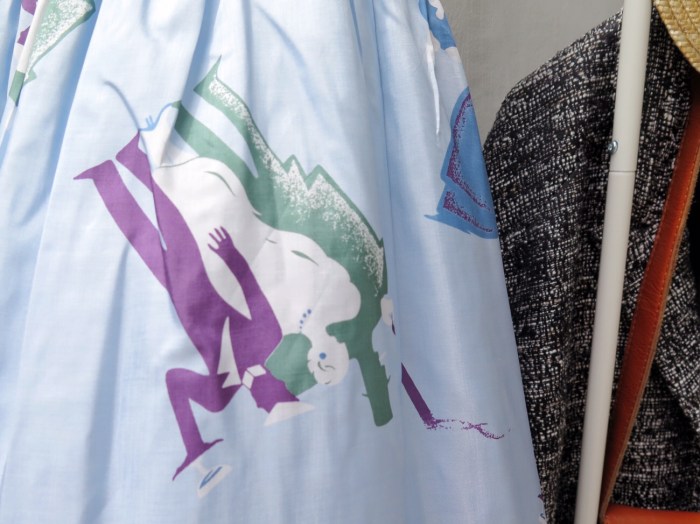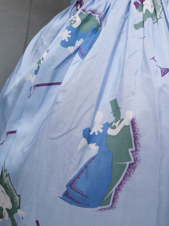 We love the slight sheen on this dress with her awesome pop-art graphic print of a couple dancing. The sheen gives it an elegance and quiet beauty. And we love the print of a cocktail glass sprinkled throughout the dress.