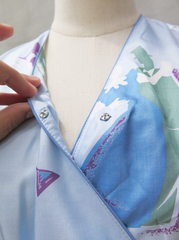 Popover style, with snap buttons in the front bust area. Elastic waist.