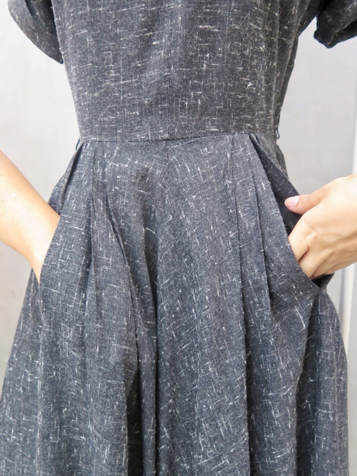This grey 1950s vintage dress with her tweed-like fabric (we actually akin it to atomic starbursts – the white weave within the fabric makes us think of staring up in the dark night sky at stars) has the most elegant turned-up cuffs, a swan-collar, very fitted waist (which could do with a red belt, if you wish to add some element of drama) and a full circle skirt.