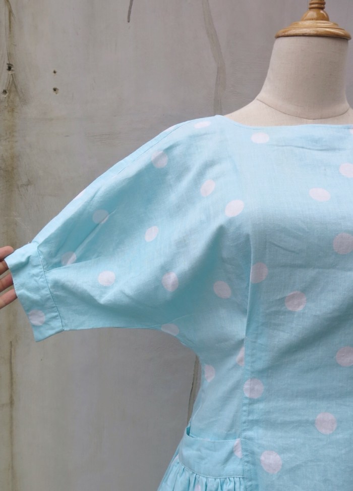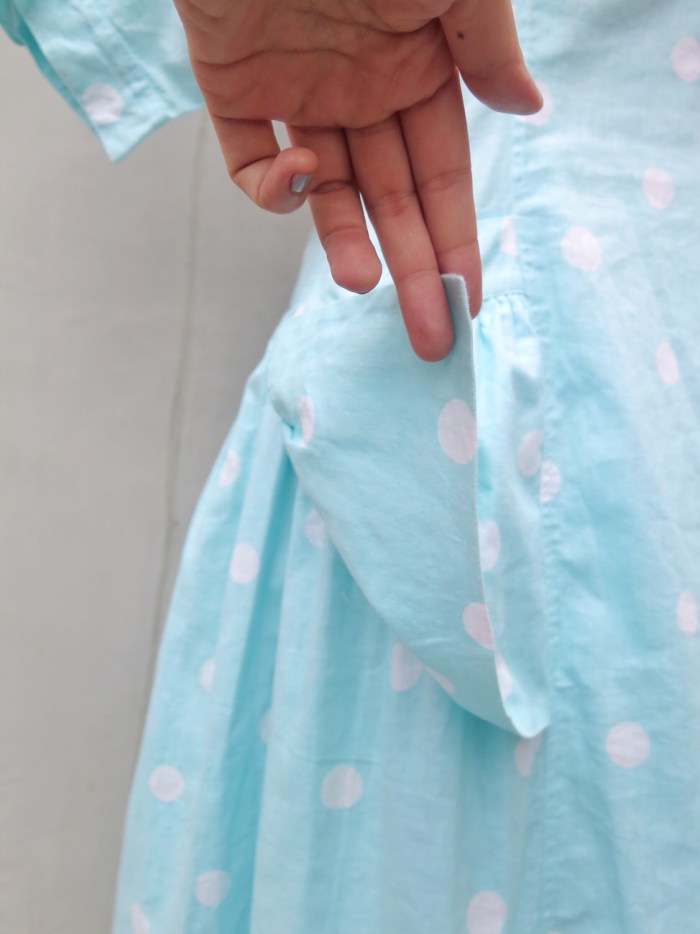This pretty blue thing has buttons down all the way at the back and we love the way it hugs curves 🙂 If you have them, celebrate them! And if you don’t, no reason to fret. This cutie comes with some really cool hip accents which seem like pockets but are not (though we think if you just sew them down, they totally could be pockets!)