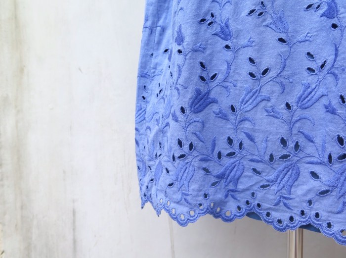 We often see some cut-out embroidery/lace elements at the neckline or the hem. But we seldom see them on both.