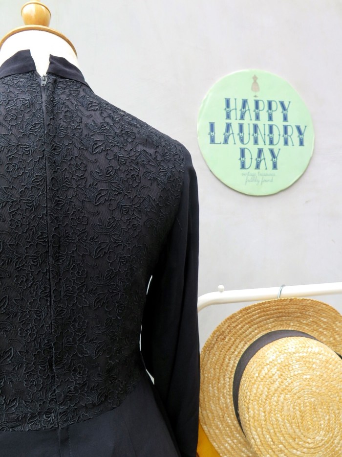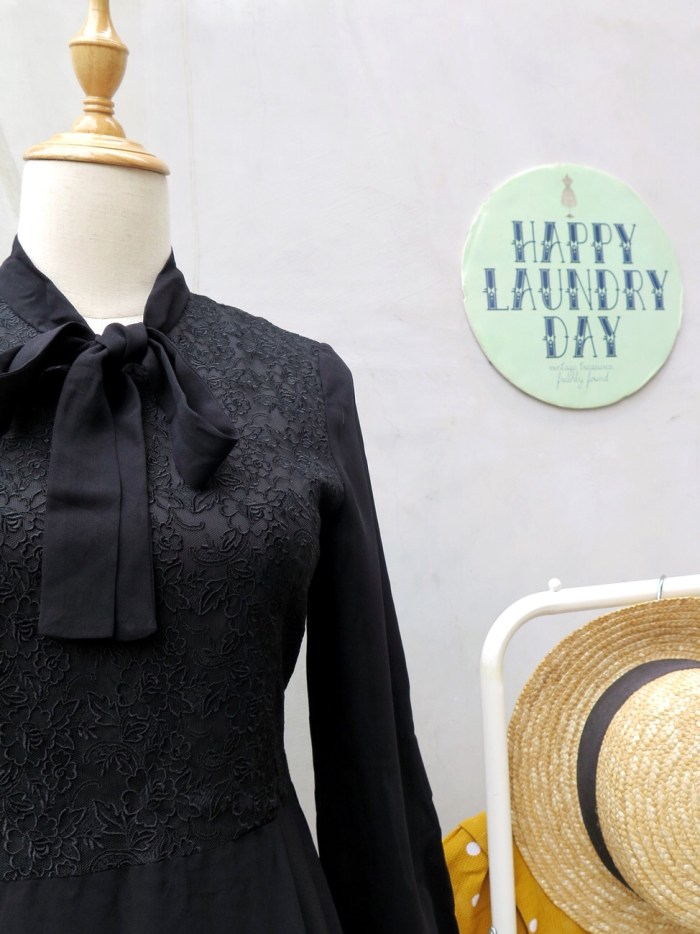 And so this one gives us such a sense of elegance with its jet-blackness, high neckline and long, thin neck-tie. The lace patterned overlay only in the bust area – lifts it instead of weighing it down. And the long, slightly puffy sleeves.