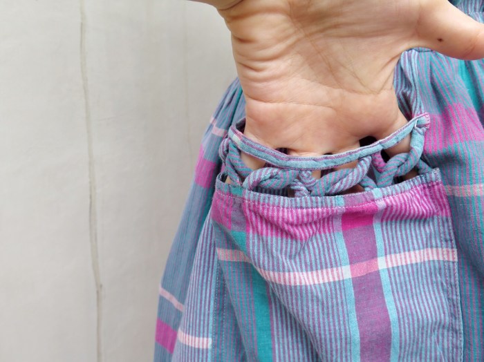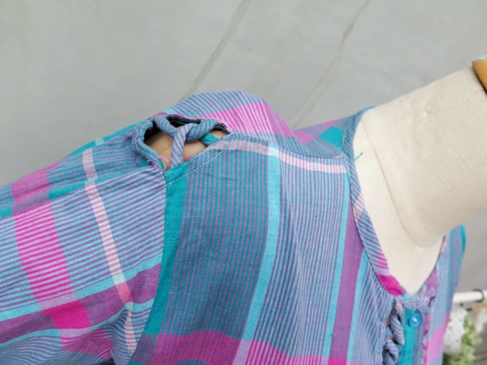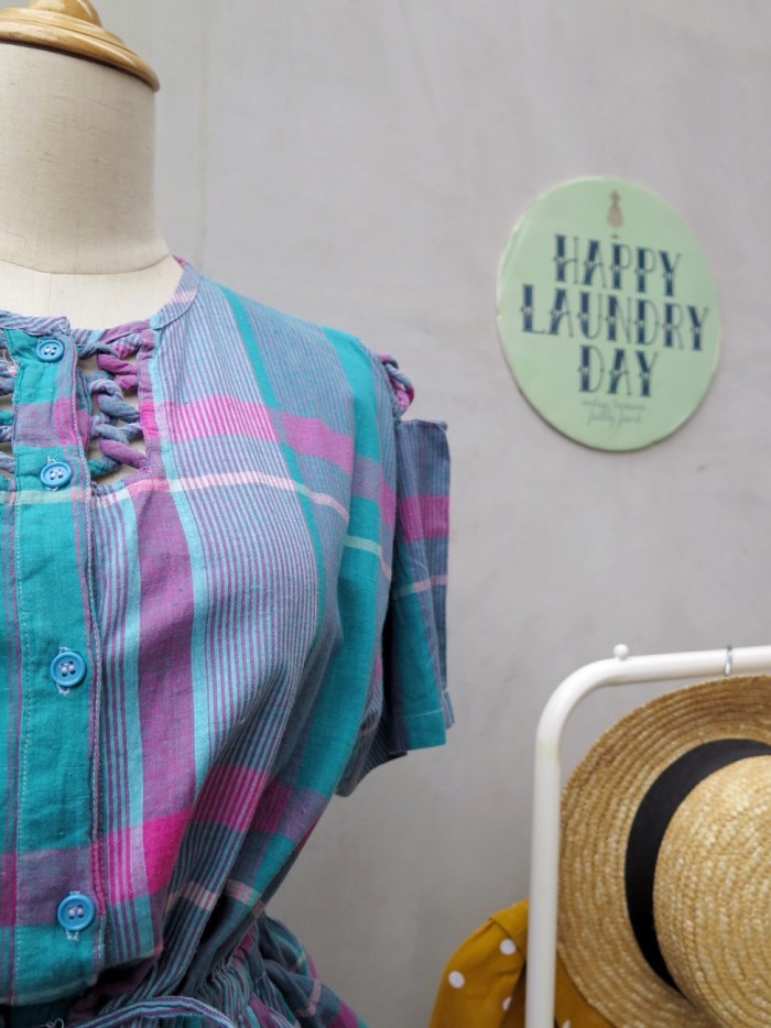 Many twists in this seemingly simple plaid dress! Where, you ask? Look at the shoulders, neckline and pockets 😉 Cute little details there that remind us of the fun, funky 80s.