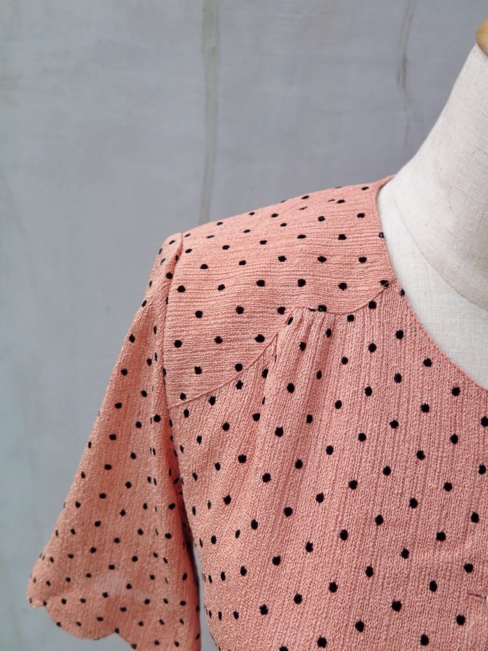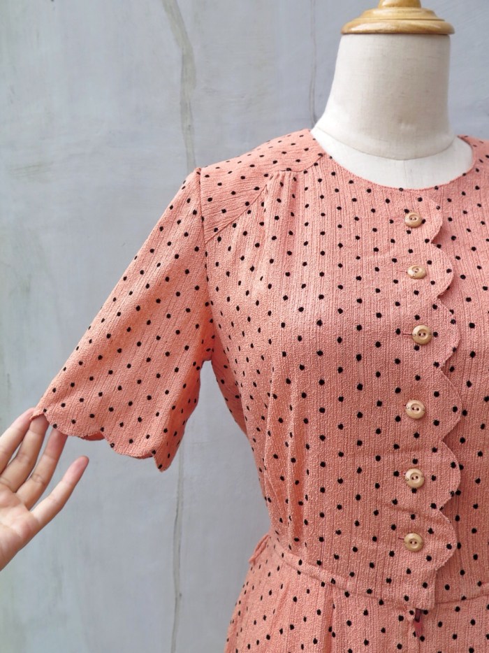 As much as we love the rare peachy-pink color on this dress, which would go great with cobalt blue suede heeled sandals or brown booties by the way, we love the scalloped edges at the bust where the buttons go even more!