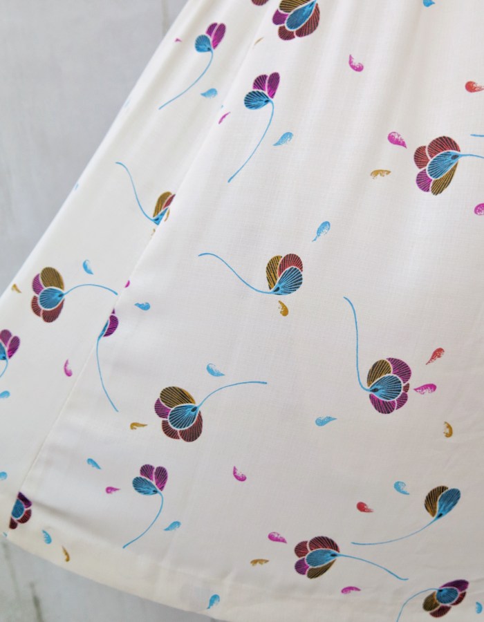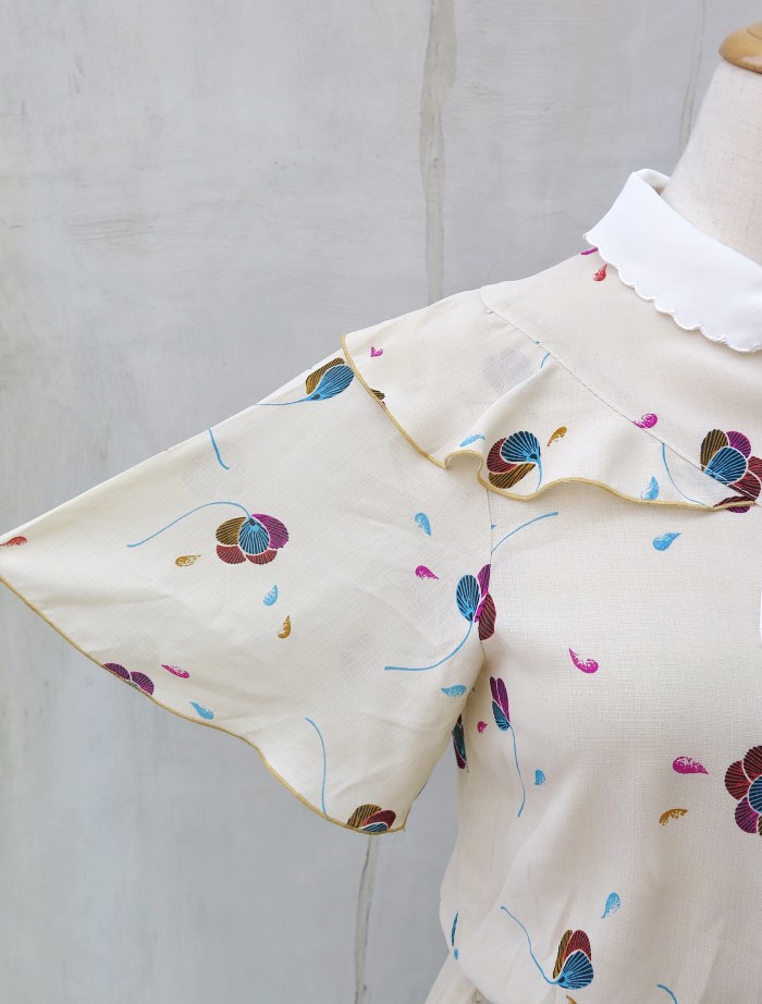 This dress gives us that feeling. With her pretty scalloped collar, velvet tie, flowy chiffon fabric, just the right amount of frills, pearl used beaded buttons and retro floral prints in the most gorgeous muted colours.