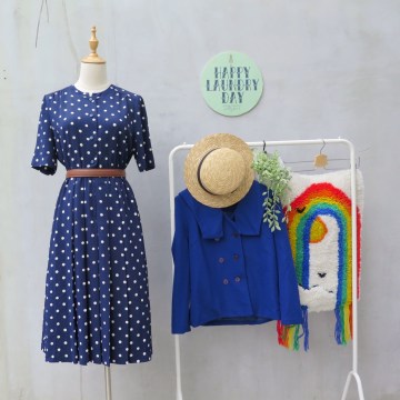 Winifred | Vintage 1950s 1960s V-back white navy blue tiny polka dot print swing style dress