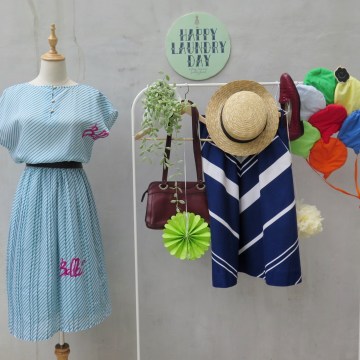 Belle air | Vintage 1980s does 1940s pleated skirt Green and white striped Day dress with Word print