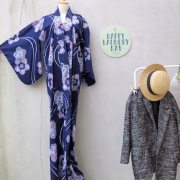 Sakura | Vintage 1960s 1970s oriental Japanese cherry blossom print Fireworks Dark blue Long traditional Kimono